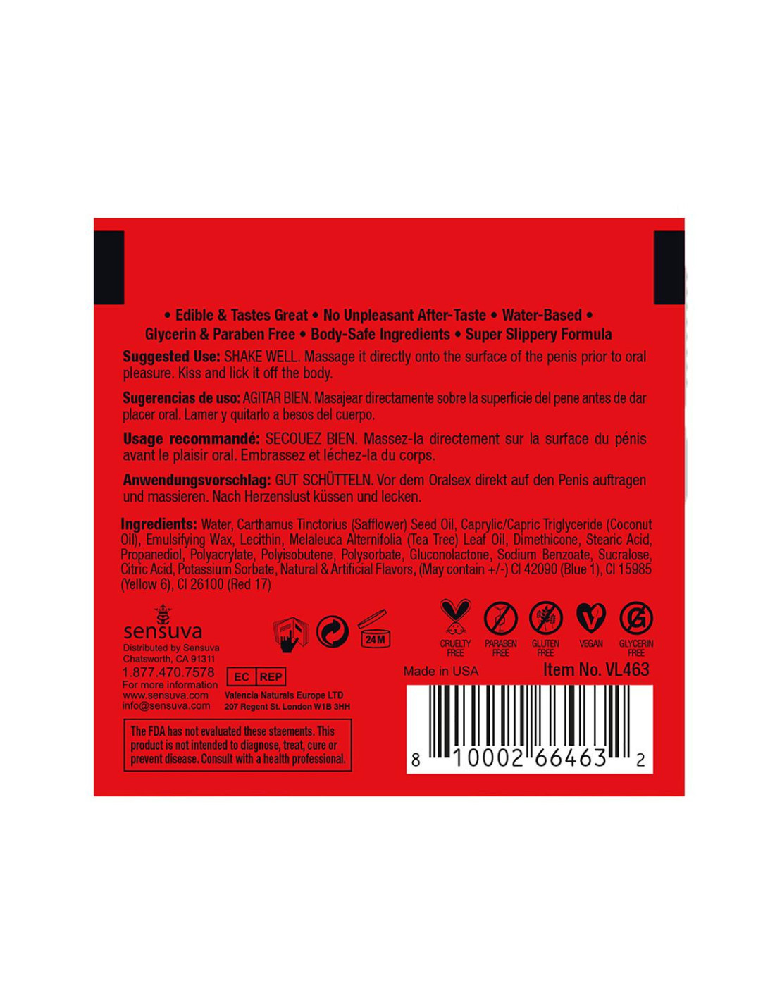 Ingredients:Water, Carthamus Tinctorius (Safflower) Seed Oil, Caprylic/Capric Triglyceride (Coconut Oil), Emulsifying Wax, Lecithin, Melaleuca Alternifolia (Tea Tree) Leaf Oil, Dimethicone, Stearic Acid, Propanediol, Polyacrylate, Polyisobutene, Polysorbate, Gluconolactone, Sodium Benzoate, Sucralose, Citric Acid, Potassium Sorbate, Natural & Artificial Flavors, (May contain +/-) CI 42090 (Blue 1), CI 15985 (Yellow 6), CI 26100 (Red 17)Cruelty FreeParaben FreeGluten FreeVeganGlycerin Free