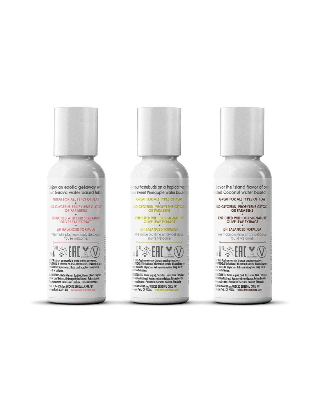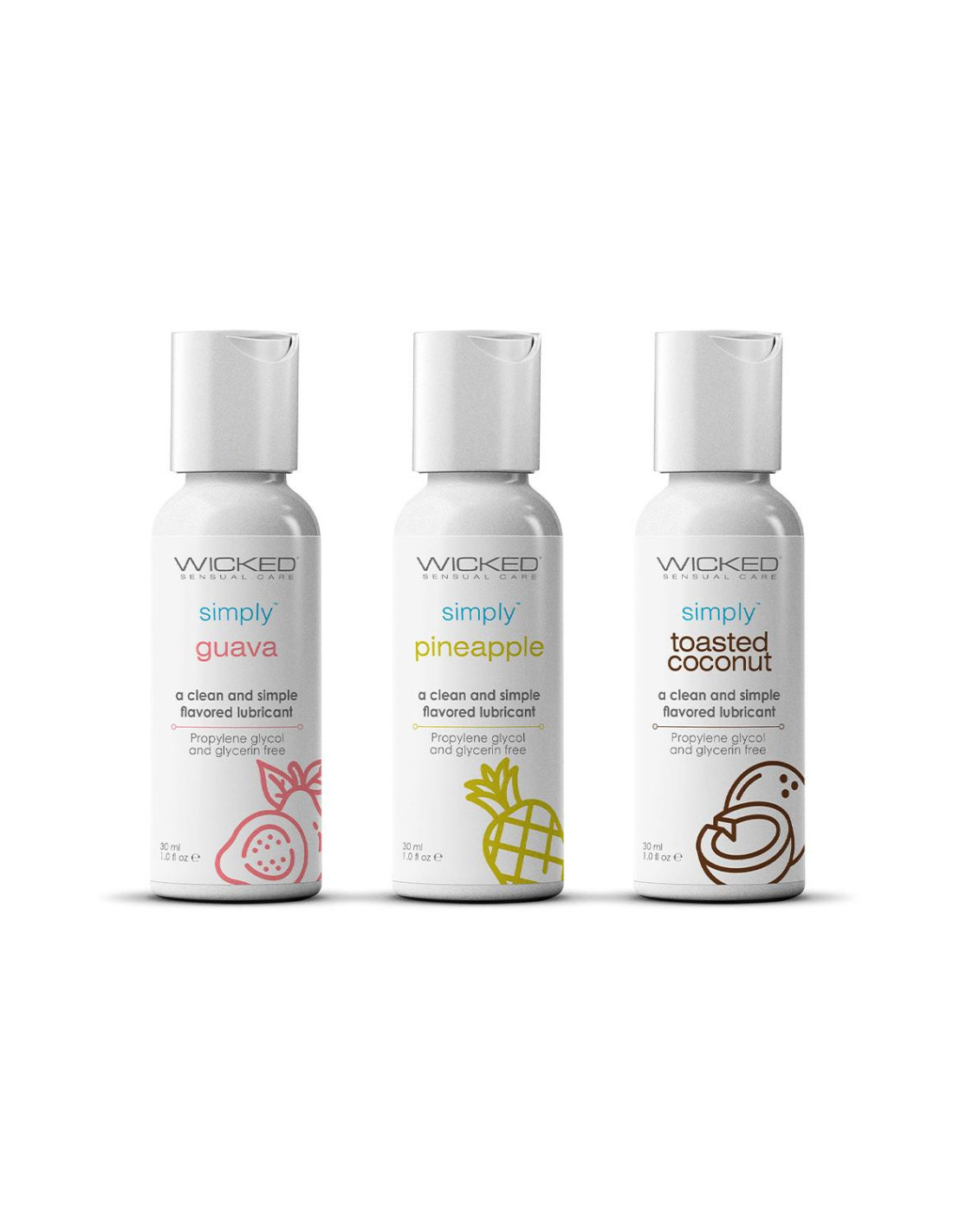 LIMITED EDITION - simply Tropical Trio travel sized flavoured lubes, waterbased.Experience tropical bliss with the simply® Tropical Trio by Wicked Sensual Care. This travel-sized set includes 3 delicious water-based lubes in Guava, Pineapple, and Toasted Coconut flavors. Perfect for all types of play and toys. These brand new simply® tropical flavors are available exclusively in this kit and only for a limited time. Sweetened with Stevia, no glycerin, parabens, or Propylene GlycolVegan & Cruelty FreepH Balanced3 x 1 fl oz / 30 mlWaterbasedFlavours: Guava, Pineapple, Toasted CoconutPropylene glycol and glycerin freeWith olive leaf extractVeganCruelty freeSweetened with SteviaNo glycerinNo parabensNo Propylene GlycolpH balancedWe made playtime tropical AND tastier. You're welcome - Wicked Sensual Care