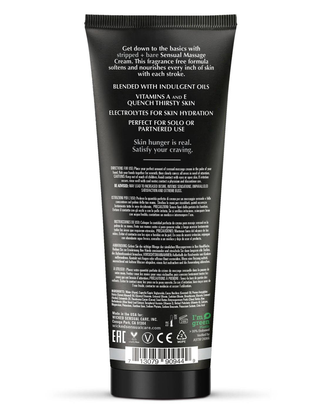 Stripped + Bare Massage Cream, because skin hunger is real.Vitamins A & EFragrance free lotionFor external use onlyCan be used as a daily lotionVeganCream-to-liquidGet down to the basics with stripped + bare Sensual Massage Cream. This fragrance free formula softens and nourishes every inch of skin with each stroke.Blended with indulgent oilsVitamins A and E quench thirsty skinElectrolytes for skin hydrationPerfect for solo or partnered useSkin hunger is real. Satisfy your craving for touch with Wicked Sensual Care.Directions for use: Place your perfect amount of sensual massage cream in the palm of your hand. Rub your hands together for warmth, then slowly caress all areas in need of attention.Be advised: May lead to increased desire, intense sensations, unparalleled satisfaction and extreme bliss.Stripped + Bare Massage Cream Ingredient (s): Water (Aqua), Caprylic/Capric Triglyceride, Cocos Nucifera (Coconut) Oil, Prunus Amygdalus Dulcis (Sweet Almond) Oil, Cetearyl Olivate, Glyceryl Stearate, Dimethicone, Glycerin, Cetearyl Alcohol, Theobroma Cacao (Cocoa) Seed Butter, Butyrospermum Parkii (Shea) Butter, Aloe Barbadensis (Aloe Vera) Leaf Extract, Tocopheryl Acetate (Vitamin E), Retinyl Palmitate (Vitamin A), Ascorbic Acid, Sorbitan Olivate, Ceteareth-20, Calcium, Magnesium, Potassium, Xanthan Gum, Sodium Phytate, Sodium Benzoate, Potassium Sorbate, Citric AcidCautions: Keep out of reach of children. Avoid contact with eyes or open skin.If irritation occurs, rinse well with cool water, contact a physician and discontinue use.Massage and Relaxation ProductsWicked Sensual Care massage products are perfect when your body craves touch and relaxation. Skin hunger is real. Satisfy your craving for touch with Stripped + Bare, Orange Blossom + Patchouli, and Sage + Sea Salt sensual massage creams.