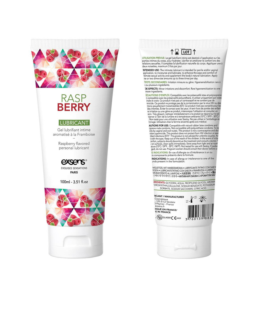 Take a walk in the woods... This ultra pure water based lubricant with the aroma of Raspberry provides a natural sensation for greater sexual comfort.Medical deviceDoes not stickSlipperyCompatible with latex and polyisopropene condomsEdible. Suitable for vaginal and oral useLubricates and moisturizes the vaginal mucous membranesImproves the comfort of sexual relationsIngredients: glycerin, water, propylene glycol, flavor, hydroxyethyl cellulose, sodium benzoate, potassium sorbate, sodium saccharin, citric acidWaterbased lubricantsThe 3 water based lubricants from Exsens come with Candy Apple flavour, with organic Aloe Vera extract and with Raspberry flavour. The lubricant gels have great gliding properties, are not sticky and are suitable for vaginal use. The lubes are compatible with latex and polyisopropene condoms.