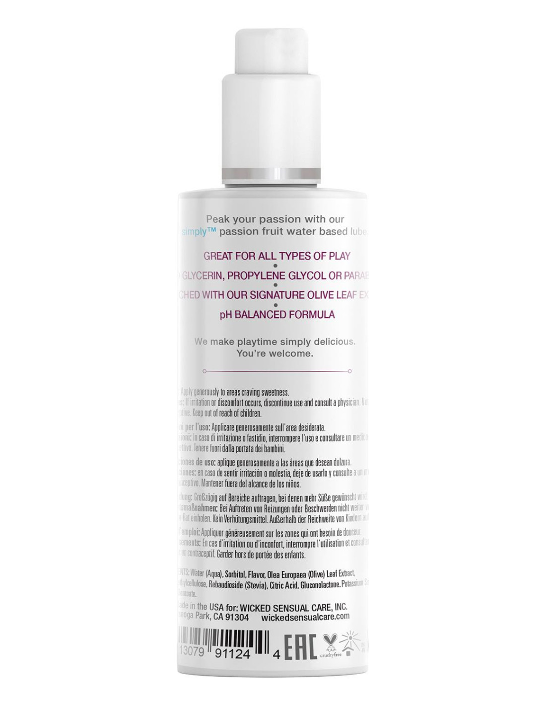 Peak your passion with Simply™ passion fruit water based lube. Wicked just made playtime simply delicious. Simply™ Passion Fruit is a clean and simple flavored lubricant.Waterbased flavored lubricant120 mlPassion Fruit flavorPropylene glycol freeGlycerin freeWith olive leaf extractSweetened with SteviaCruelty freeVeganpH balancedsimply™ Collection with clean ingredientsWicked Sensual Care’s simply™ line is a collection of water-based and hybrid lubricants that are also glycerin and propylene-glycol free. When you want a clean lube… do it simply™.Flavoured lubessimply™ Brown Sugar, Passion Fruit, and Pear flavoured lubricants are for those who want a delicious way to enjoy oral pleasures. Wicked Sensual Care’s flavoured lubes are water-based, completely edible and come in several tantalizing flavours. They are made from the finest ingredients for superior performance and lightly sweetened with Stevia. Each product has been designed to be amazingly slick, extra long lasting and never sticky or tacky. Directions:Apply generously to area(s) where sweet lube is desired. Cleans away easily with water. If irritation occurs, discontinue use and consult a physician. Ingredients: Water (Aqua), Sorbitol, Flavor, Olea Europaea (Olive) Leaf Extract, Hydroxyethylcellulose, Rebaudioside (Stevia), Citric Acid, Gluconolactone. Potassium Sorbate, Sodium Benzoate.