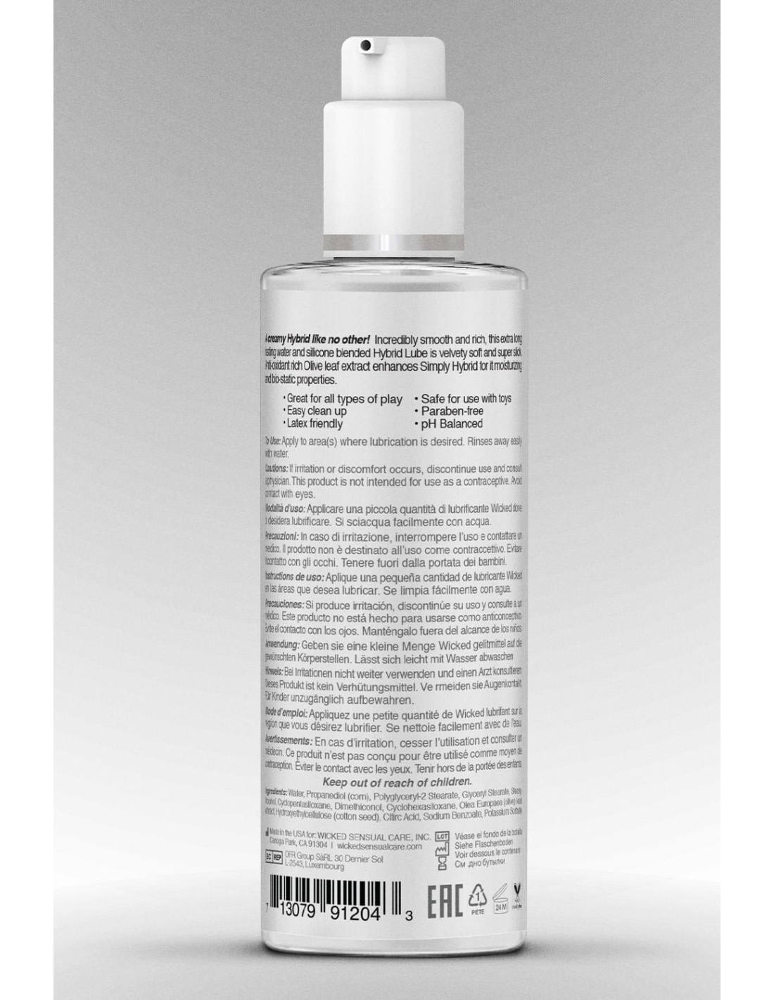 inhibits the spread of harmful bacteria and microorganisms. When you’re ready for a clean lube, do it Simply. Simply Hybrid is a creamy hybrid. The pearly white color is a sought after color for many, great for use with ejaculating dildos and with ‘cum play’. It has a really natural feel, a very nice formula that is safe with silicone toys.Simply Hybrid is a creamy, realistic hybrid. Incredibly smooth and long lasting. Free of Glycerin, Propylene Glycol, and Parabens. Antioxidant-rich Olive Leaf Extract enhances this formula with its moisturizing and biostatic properties. Vegan, cruelty free, and PH balanced. Directions: Apply to the area(s) where lubrication is desired. Cleans away easily with water.Ingredients: Water, Propanediol (corn),Polyglyceryl-2 Stearate,Glyceryl Stearate, Stearyl Alcohol,Cyclopentasiloxane,Dimethiconol, Cyclohexasiloxane, Olea Europaea (olive) leaf extract,Hydroxyethylcellulose (tree bark), Citric Acid, Sodium Benzoate,Potassium Sorbate