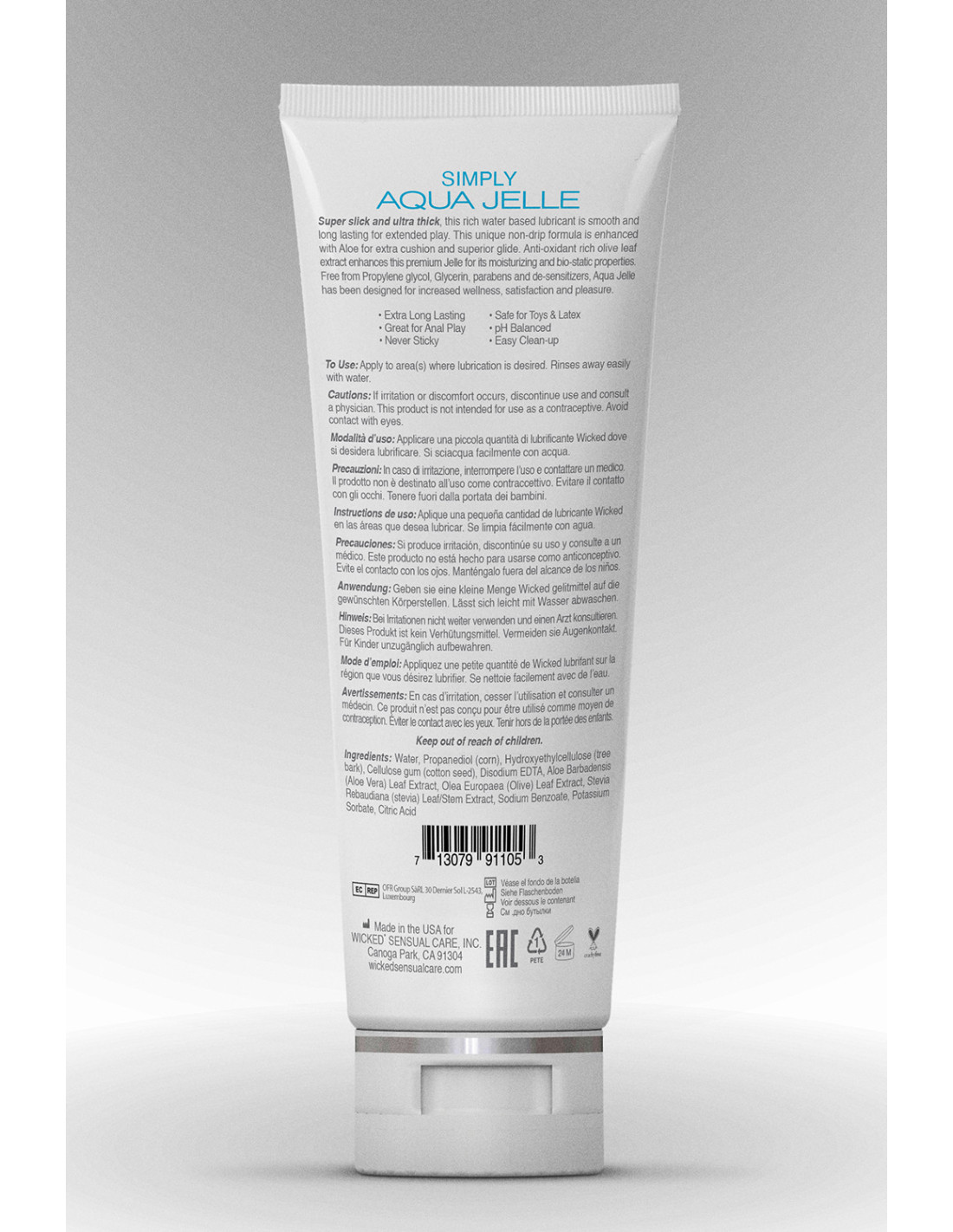 inhibits the spread of harmful bacteria and microorganisms. When you’re ready for a clean lube, do it Simply. Simply Aqua Jelle: Wicked is great at jelle formulas and this is one of them. It has the addition of Aloe for its healing properties and viscosity. Great for all types of play, including anal and Simply Aqua Jelle also has the addition of stevia, for a sweet taste that’s pleasant orally.Super slick and ultra-thick, simply Aqua Jelle is a clean, water-based lubricant that is smooth and long lasting for extended play. This unique non-drip formula is enhanced with Aloe for extra cushion and superior glide. Antioxidant rich Olive Leaf Extract enriches this formula with its moisturizing and biostatic properties. Directions: Apply to the area(s) where lubrication is desired. Cleans away easily with water.Ingredients: Water,Propanediol ( corn),Cellulose gum (cotton seed ),Cellulose gum, Hydroxyethylcellulose (tree bark ), Aloe Barbadensis ( Aloe Vera) Leaf Extract, Disodium EDTA, Olea Europaea (olive) leaf extract, Stevia Rebaudiana (stevia) Leaf/Stem Extract,Citric Acid, Sodium Benzoate,Potassium Sorbate