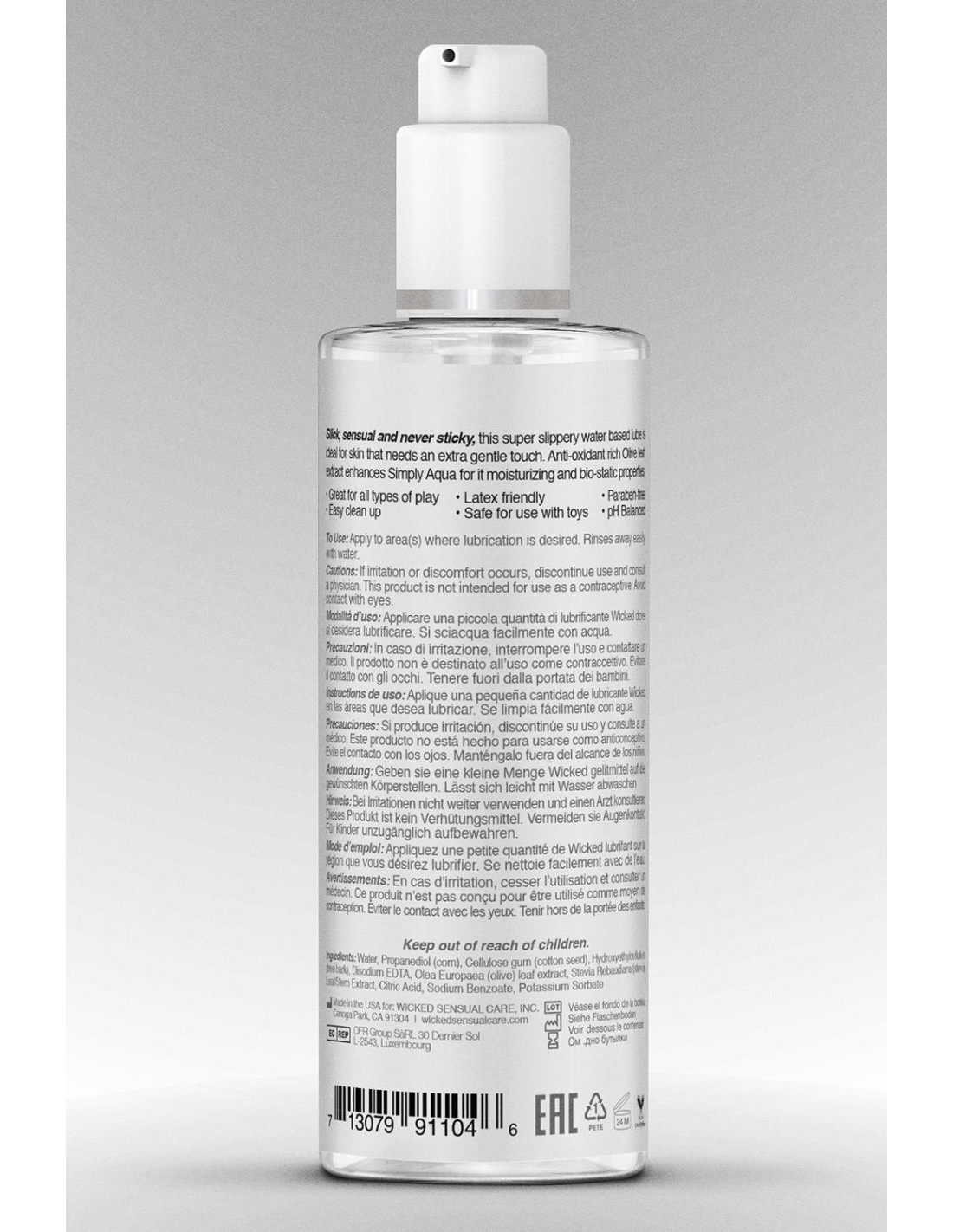 is an amazing glide that brings a new attribute: this is a reactivation formula, with stevia added to its formula so it’s truly great for all types of play and orally pleasing.Heighten sensation and increase pleasure with simply Aqua, a clean, PH balanced waterbased lubricant that is slick, sensual and never sticky. Free of glycerin, Propylene Glycol, and Parabens. Vegan, cruelty free, and enhanced with antioxidant rich Olive Leaf Extract for moisturizing and biostatic properties. Directions: Apply to the area(s) where lubrication is desired. Cleans away easily with mild soap and water. Ingredients: Water, Propanediol ( corn), Cellulose gum (cotton seed ), Hydroxyethylcellulose (tree bark), Disodium EDTA, Olea Europaea (olive) leaf extract, Stevia Rebaudiana (stevia) Leaf/Stem Extract, Citric Acid, Sodium Benzoate, Potassium Sorbate