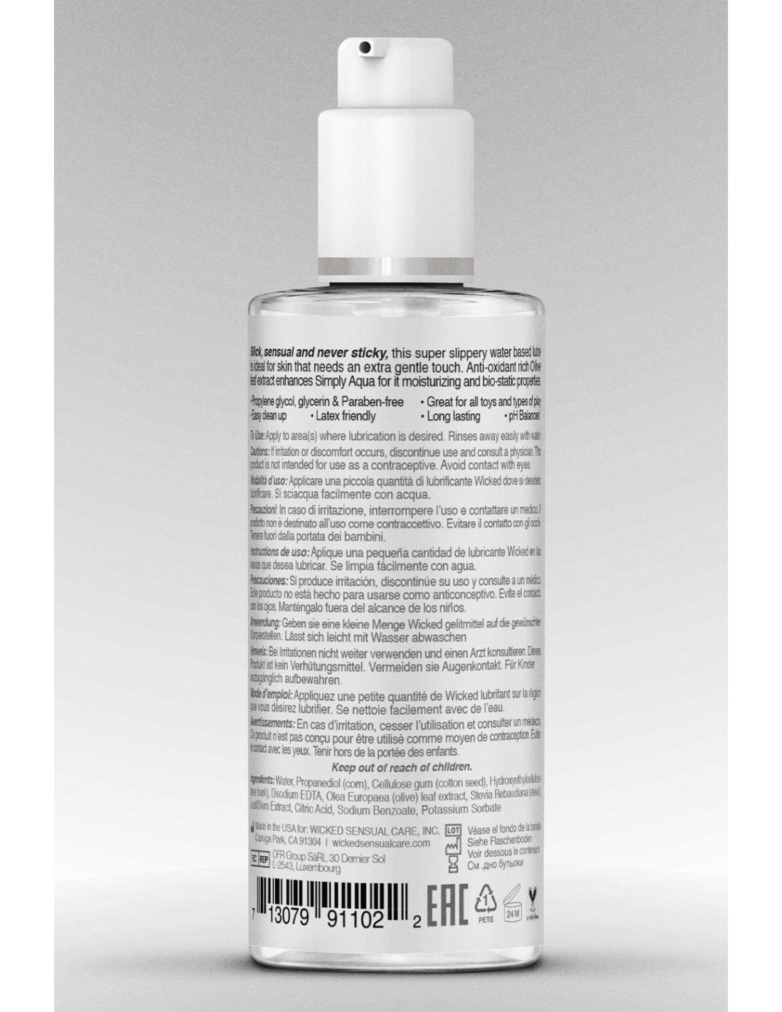 is an amazing glide that brings a new attribute: this is a reactivation formula, with stevia added to its formula so it’s truly great for all types of play and orally pleasing.Heighten sensation and increase pleasure with simply Aqua, a clean, PH balanced waterbased lubricant that is slick, sensual and never sticky. Free of glycerin, Propylene Glycol, and Parabens. Vegan, cruelty free, and enhanced with antioxidant rich Olive Leaf Extract for moisturizing and biostatic properties.Directions: Apply to the area(s) where lubrication is desired. Cleans away easily with mild soap and water.Ingredients: Water, Propanediol ( corn), Cellulose gum (cotton seed ), Hydroxyethylcellulose (tree bark), Disodium EDTA, Olea Europaea (olive) leaf extract, Stevia Rebaudiana (stevia) Leaf/Stem Extract, Citric Acid, Sodium Benzoate, Potassium Sorbate