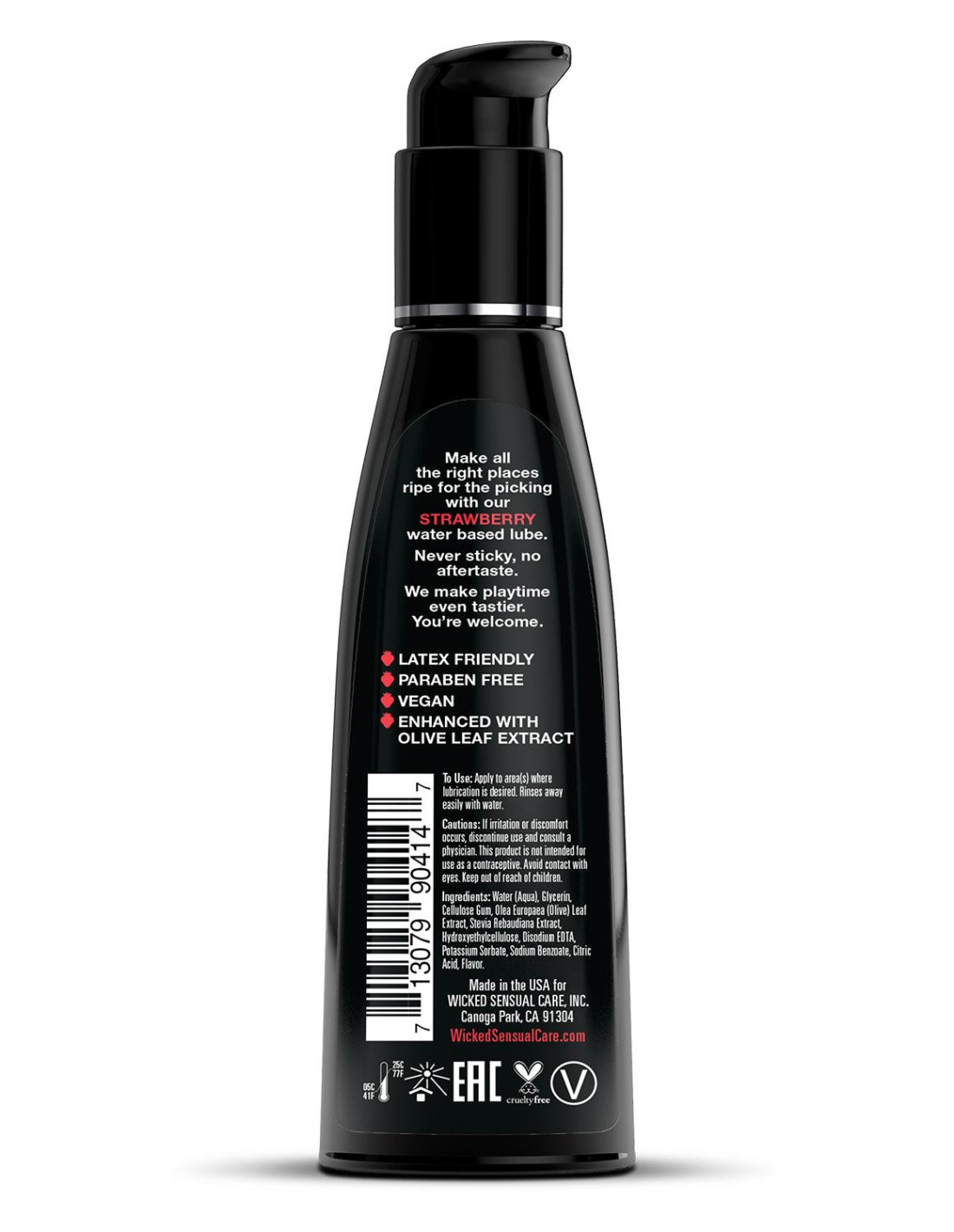 Bring Strawberries into the bedroom in a whole new way! Kissable, lickable, and delicious, Wicked Aqua Strawberry personal lubricant adds subtle and delicious natural flavours to enhance oral pleasures. Light and silky, this water-based formula is the perfect sensual combination of an elegant lubricant and a flavour sensation. Never sticky and without an aftertaste, Wicked Aqua Strawberry satisfies your sweet tooth and your intimate desires all in one amazing pleasure product. Oral sex never tasted so good. Whether you are giving or receiving, Wicked flavours will give you a new sexy confidence. Wicked flavoured lubes are sweetened with Stevia, making them safe for oral, vaginal and anal play.120mlLong lastingLatex friendlyParaben freeNever stickyNo aftertasteEnhanced with Olive Leaf ExtractVegan - no animal by-products or testingDirections: Apply to area(s) where lubrication is desired. Cleans away easily with water.Ingredients: Water, Glycerin, Cellulose Gum, Stevia Rebaudiana Extract, Olea Europaea (Olive) Leaf Extract, Hydroxyethylcellulose, Tetrasodium EDTA, Citric Acid, Sodium Benzoate, Potassium Sorbate, Flavor