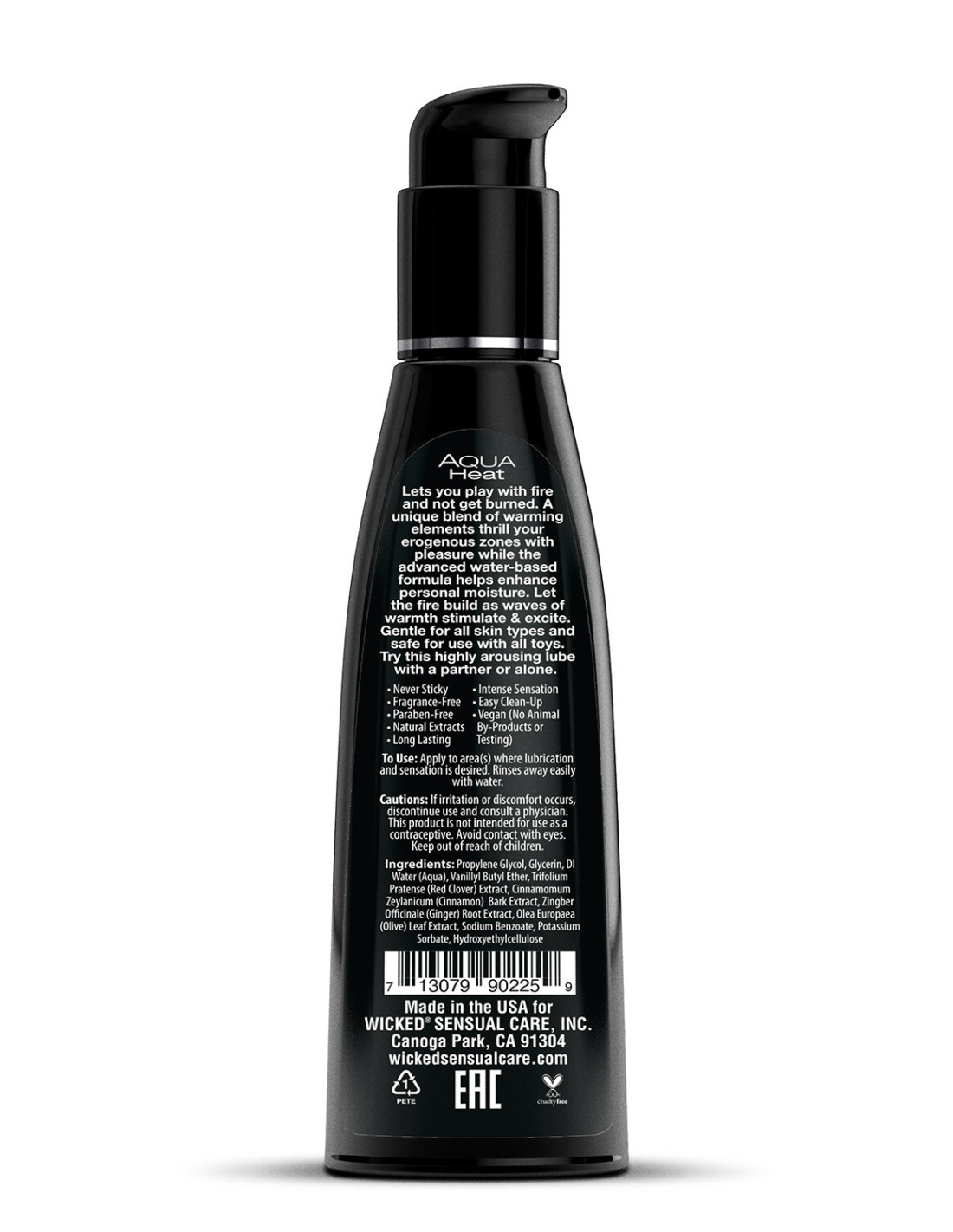 Heat up your intimate moments with Wicked Aqua Heat personal lubricant. Carefully crafted with a unique blend of warming elements that will thrill your erogenous zones, this advanced water-based lubricant increases personal moisture for silky sensations. Let the fire build as waves of warmth stimulate and excite. Indulge in this highly arousing personal lube with a partner or alone.Never stickyFragrance freeParaben freeNatural extractsWarming sensationLong lastingEnhanced with olive leaf extractVegan - No animal by-products or testingUse: Apply to area(s) where lubrication and sensation is desired. Rinses away easily with water.Ingredients:Propylene Glycol, Glycerin, DI Water (Aqua), Vanillyl Butyl Ether, Trifolium Pratense (Red Clover) Extract, Cinnamomum Zeylanicum (Cinnamon) Bark Extract, Zingber Officinale (Ginger) Root Extract, Olea Europaea (Olive) Leaf Extract, Sodium Benzoate, Potassium Sorbate, Hydroxyethylcellulose