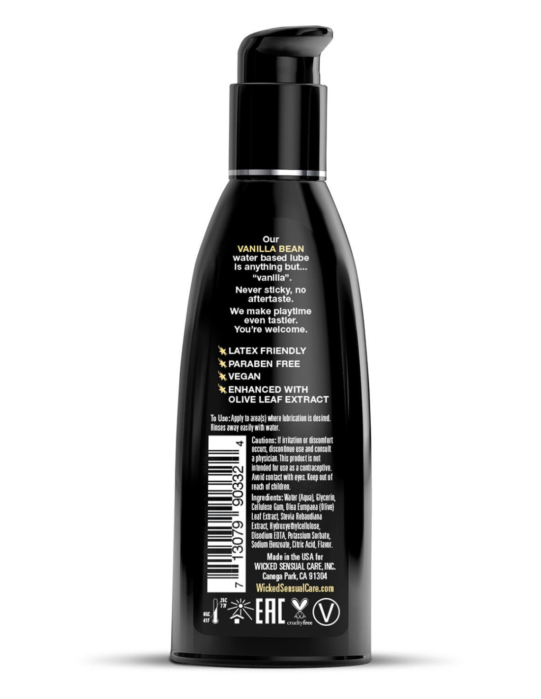 Indulge in the sweetness of vanilla bean lube! Kissable, lickable, and delicious, Wicked Aqua Vanilla Bean personal lubricant adds subtle and delicious natural flavours to enhance oral pleasures. Light and silky, this water-based formula is the perfect sensual combination of an elegant lubricant and a flavour sensation. Never sticky and without an aftertaste, Wicked Aqua Vanilla Bean satisfies your sweet tooth and your intimate desires all in one amazing pleasure product. Oral sex never tasted so good. Whether you are giving or receiving, Wicked flavours will give you a new sexy confidence. Wicked flavoured lubes are sweetened with Stevia, making them safe for oral, vaginal and anal play.60 mlLong lastingLatex friendlyParaben freeNever stickyNo aftertasteEnhanced with Olive Leaf ExtractSweetened with SteviaVegan - no animal by-products or testingUse: Apply to area(s) where lubrication is desired. Cleans away easily with water.Ingredients: Water, Glycerin, Cellulose Gum, Stevia Rebaudiana Extract, Olea Europaea (Olive) Leaf Extract, Hydroxyethylcellulose, Tetradsodium EDTA, Citric Acid, Sodium Benzoate, Potassium Sorbate, Flavour.