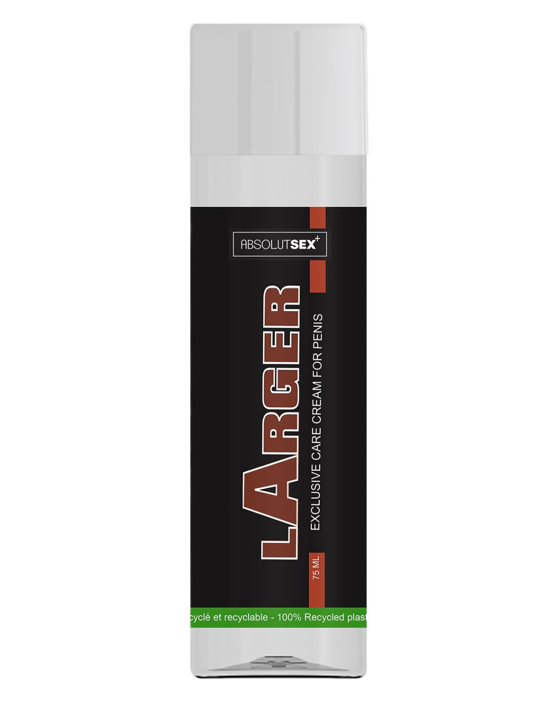 Larger is a nice smelling enlargement cream from the AbsolutSex label by Ruf. Mainly composed of Ginger for its aphrodisiac effect and fenugreek for enhancing sexual wellness. Fenugreek is one of the best natural herbs for erectile matters and libido. Some consider it to have the ability to promote natural testosterone levels (saponins and sapogenins).Penis care cream75 mlGinger: Firming the skin, promotes blood circulationFenugreek: Increases the level of testosterone, improves libido, emollient and softening action, anti-inflammatory properties, improves sexual functionsIngredients: Aqua, glycerin, PEG-40 hydrogenated castor oil, phenoxyethanol, carbomer, triethanolamine, chlorphenesin, trigonella foenum-graecum seed extract, zingiber officinale root extract, zingiber officinale root oil, ethylhexylglycerin, citric acid, potassium sorbate, sodium benzoate, tocopherol, helianthus annuus seed oil, limonene, citral, geraniol.Our new 100% recycled and recyclable plastic cosmetic bottles stand out