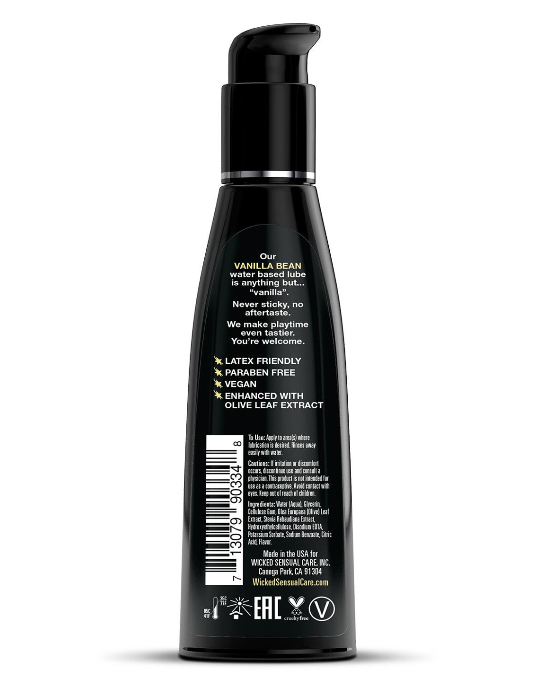 Indulge in the sweetness of vanilla bean lube! Kissable, lickable, and delicious, Wicked Aqua Vanilla Bean personal lubricant adds subtle and delicious natural flavours to enhance oral pleasures. Light and silky, this water-based formula is the perfect sensual combination of an elegant lubricant and a flavour sensation. Never sticky and without an aftertaste, Wicked Aqua Vanilla Bean satisfies your sweet tooth and your intimate desires all in one amazing pleasure product. Oral sex never tasted so good. Whether you are giving or receiving, Wicked flavours will give you a new sexy confidence. Wicked flavoured lubes are sweetened with Stevia, making them safe for oral, vaginal and anal play.120 mlLong lastingLatex friendlyParaben freeNever stickyNo aftertasteEnhanced with Olive Leaf ExtractSweetened with SteviaVegan - no animal by-products or testingUse: Apply to area(s) where lubrication is desired. Cleans away easily with water.Ingredients: Water, Glycerin, Cellulose Gum, Stevia Rebaudiana Extract, Olea Europaea (Olive) Leaf Extract, Hydroxyethylcellulose, Tetradsodium EDTA, Citric Acid, Sodium Benzoate, Potassium Sorbate, Flavour.