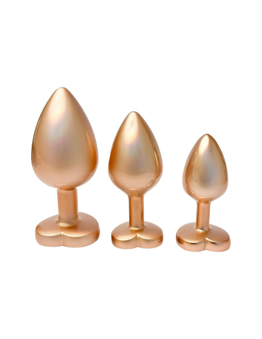 The Gleaming Love collection presents this set of gold pearl-finished anal plugs in 3 sizes, each with a gem stone. Made of smooth lightweight aluminium and seamless, these pleasure toys are easy to glide and the flared base ensures a sense of security while keeping the jewel sitting comfortably between the butt cheeks.The jewelled plugs are beautifully decorated with a delicate heart-shaped gem stone. From tip to base the seamless anal plugs feature a pearlescent sheen that pairs wonderfully with the sparkle of the matching gem stone. The tapered bulb shape of the plugs combines ease of use with erotic backdoor pleasure. The Gleaming Love plugs can be heated or cooled in water before use to provide additional sensations. A storage bag made of soft velvety fabric that closes with a drawstring is included.Large plug:length 9,5 cmdiameter 4,3 cmMedium plug:length 8,3 cmdiameter 3,4 cmSmall plug:length 7,1 cmdiameter 2,7 cm