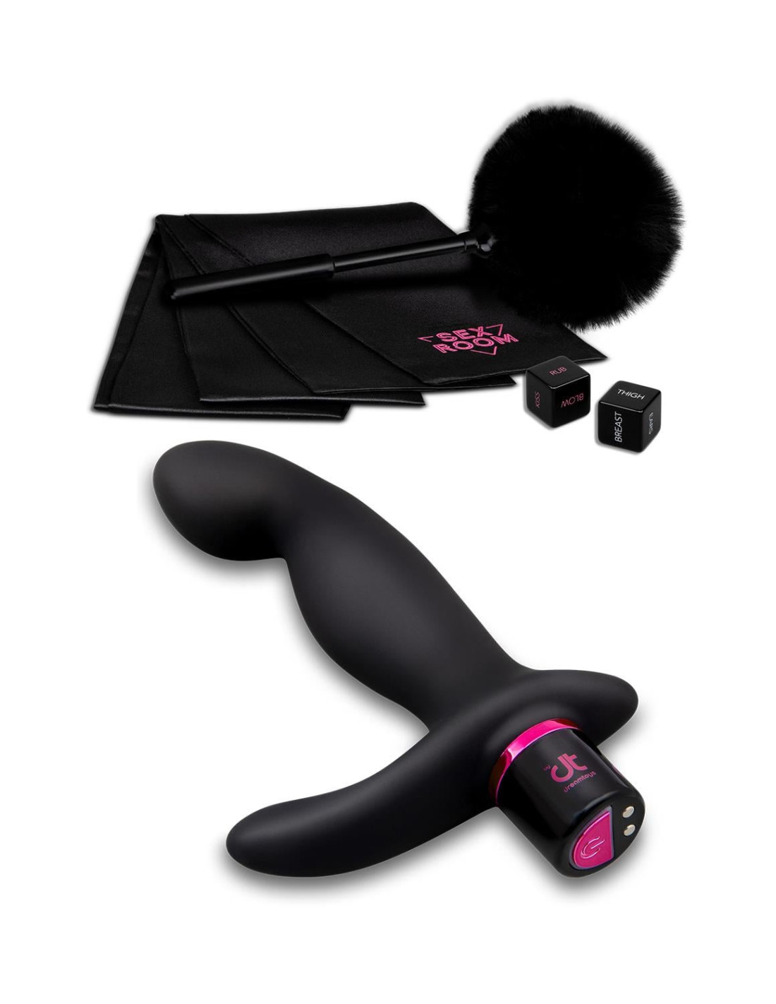 Create an erotic playground with the Sex Room Prostate Play Kit, featuring a powerful vibe for internal massage. Also included is a pair of dice, a feather tickler and satin blindfold to set the mood for sensory play.Rechargeable Prostate Play KitCurved, smooth end targets P-Spot10 Vibration modesUSB rechargeableBody-safe materialsPerfect for beginnersSpicing up your sex lifeIncludes:- Rechargeable Prostate Play Kit- Feather tickler- 2 Erotic dice- Satin blindfold tie- Organza bag- Door hanger