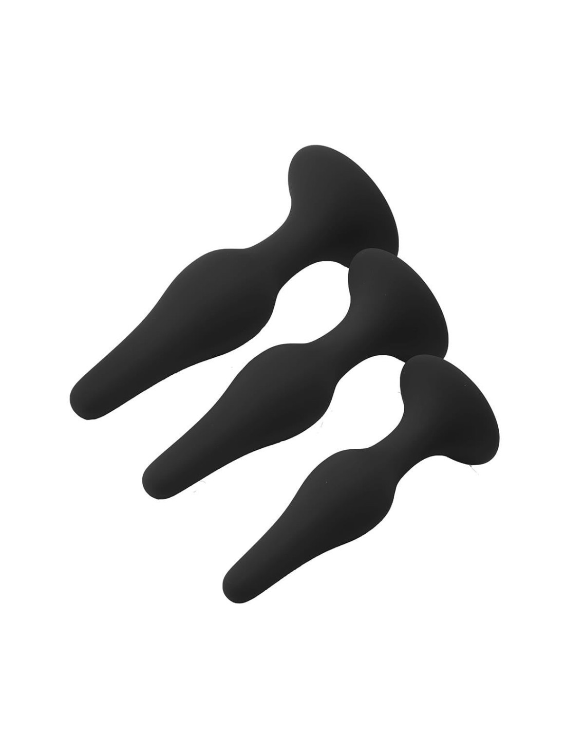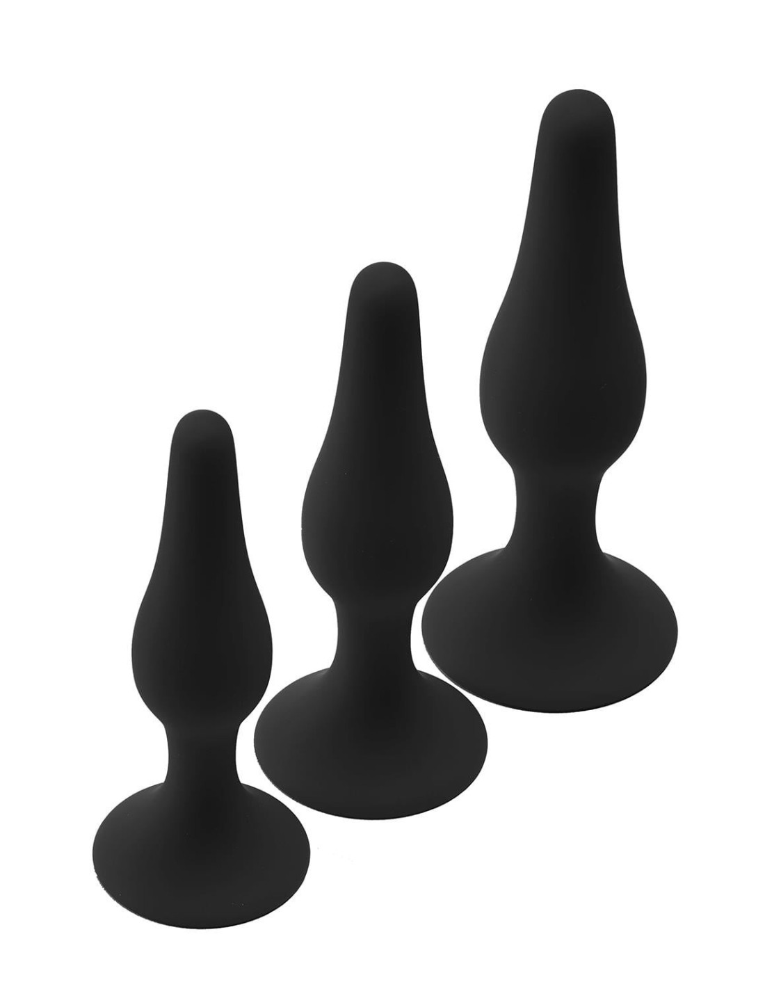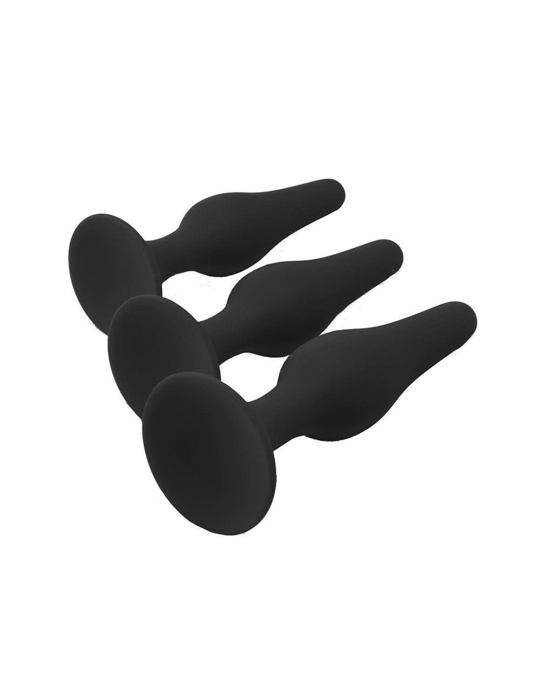 The plugs have a suction cup for hands free use.3 pc Anal plug setWith suction cupsMade of siliconeLength S – M - L: 10,5 cm - 11,3 cm - 12,8 cmWidth S – M - L: 2,5 cm - 2,8 cm - 3,2