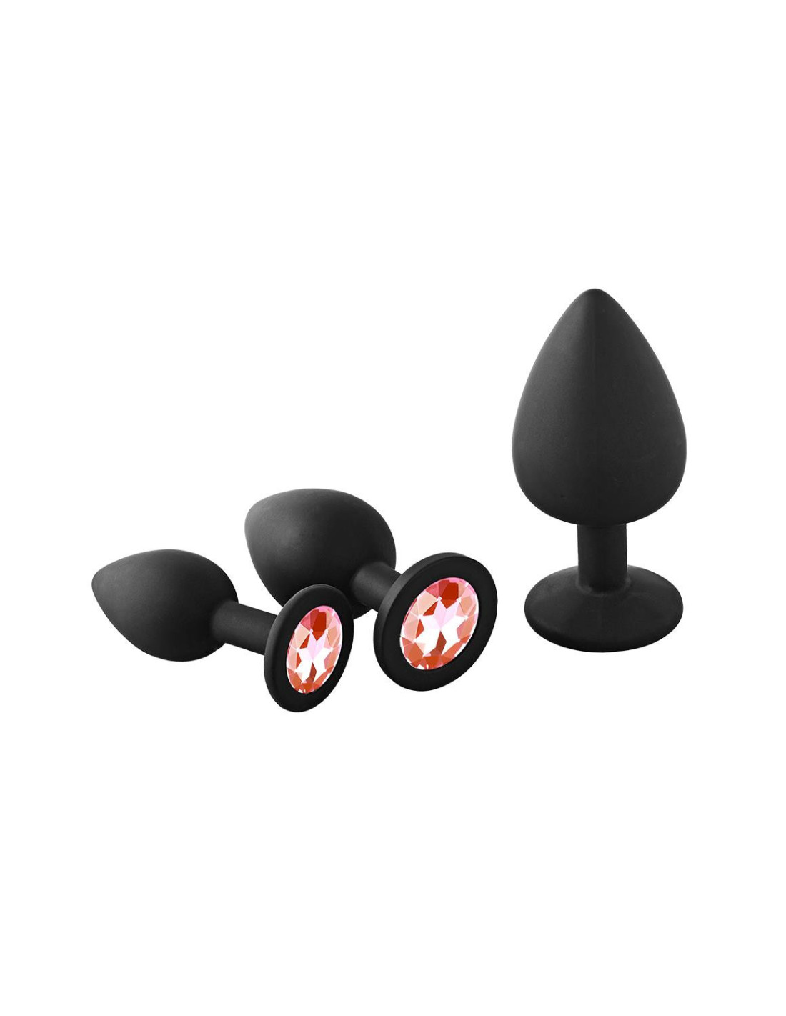 This kit features 3 anal plugs in 3 sizes. Each plug is made of silicone that is soft to the touch and has a shiny red gem stone in the base. A set with different sizes is perfect for those who wish to vary the sizes of the plugs they use and for those who want to train from small to big. Enjoy anal pleasure with a seductive look!3 pc Anal plug setWith red gem stonesMade of silicone and ABSLength S – M - L:  7,3 cm – 8,0 cm - 9,3 cmWidth S – M - L: 2,7 cm – 3,5 cm – 4,4 cm