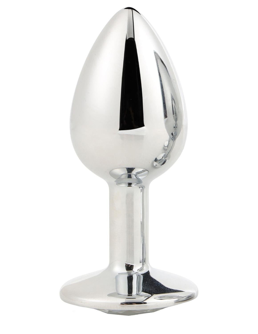 The Gleaming Love collection presents this Small sized shiny anal plug with gem stone. Made of smooth lightweight aluminium and seamless, this pleasure toy is easy to glide and the flared base ensures a sense of security while keeping the jewel sitting comfortably between the butt cheeks.This jewelled plug is beautifully decorated with a delicate round gem stone. From tip to base the