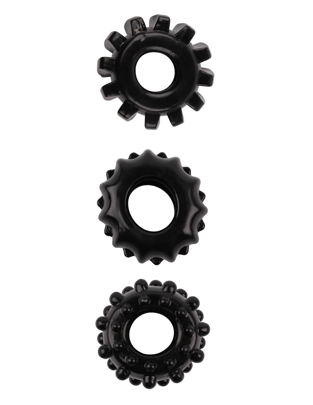 This set of 3 penis rings from the All Time Favorites label features 3 different textures. They are stretchy and because of their tight fit they ensure hard and long lasting erections, while the texture stimulates her during intercourse. Set of 3 penis rings.Various textures. Stretchy. Tight fit.