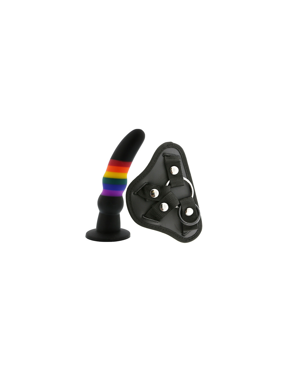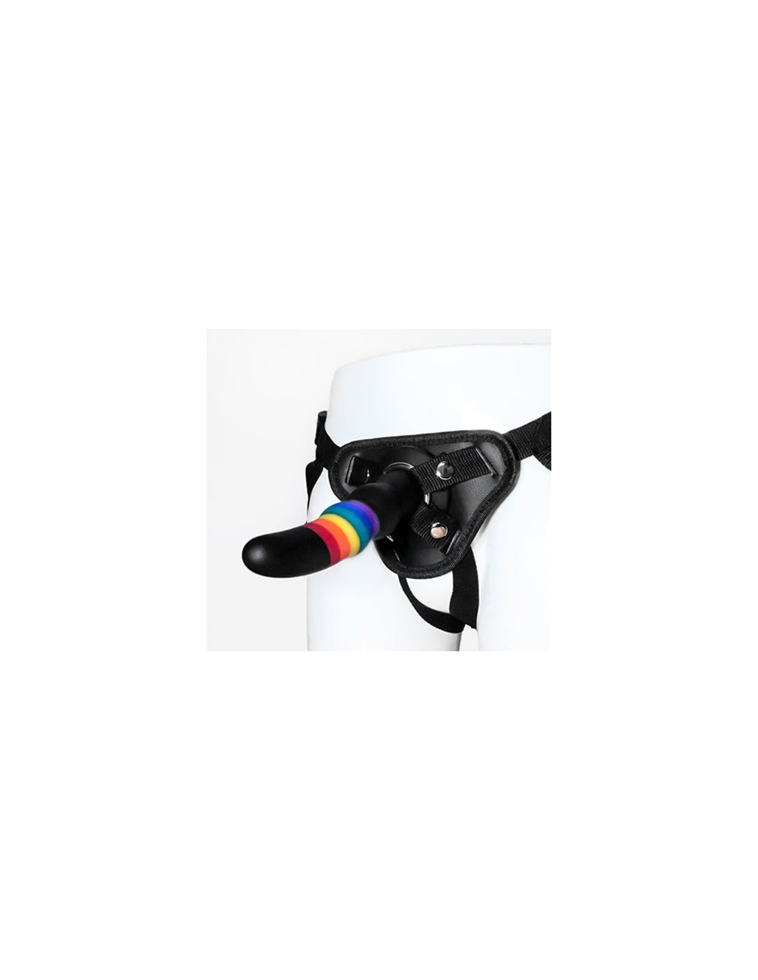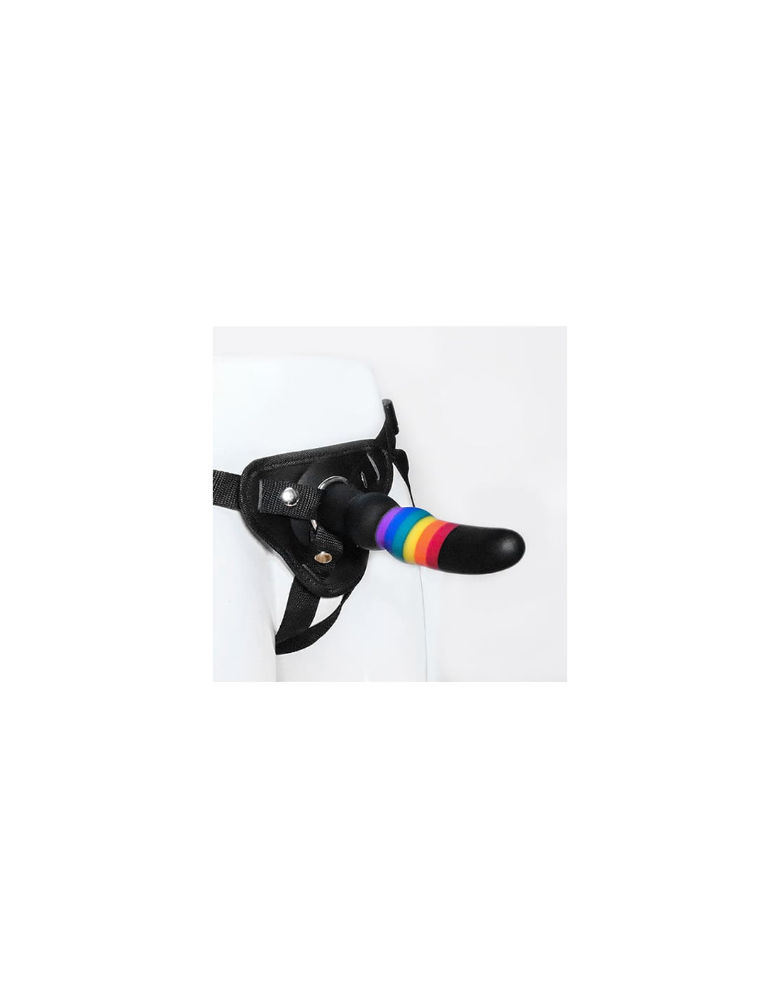 This Essentials Dildo is made of silicone, which is soft to the touch and phthalate free, with bright Pride rainbow colours combined with black. The wide base is perfect to keep the dildo firmly in place in the included strap-on harness. It can be easily attached to the harness with the snap buttons and the metal ring. The harness can be adjusted to fit the body size. Use a non-alcohol based toycleaner to clean your toy after every use. In this way you take care of your hygiene and the lifetime of your toy will be extended. Adjustable harness with detachable dildoSolid dildo, made of liquid siliconeFree of phthalates and latexThe dildo can be attached to the with O-rings and snap buttons