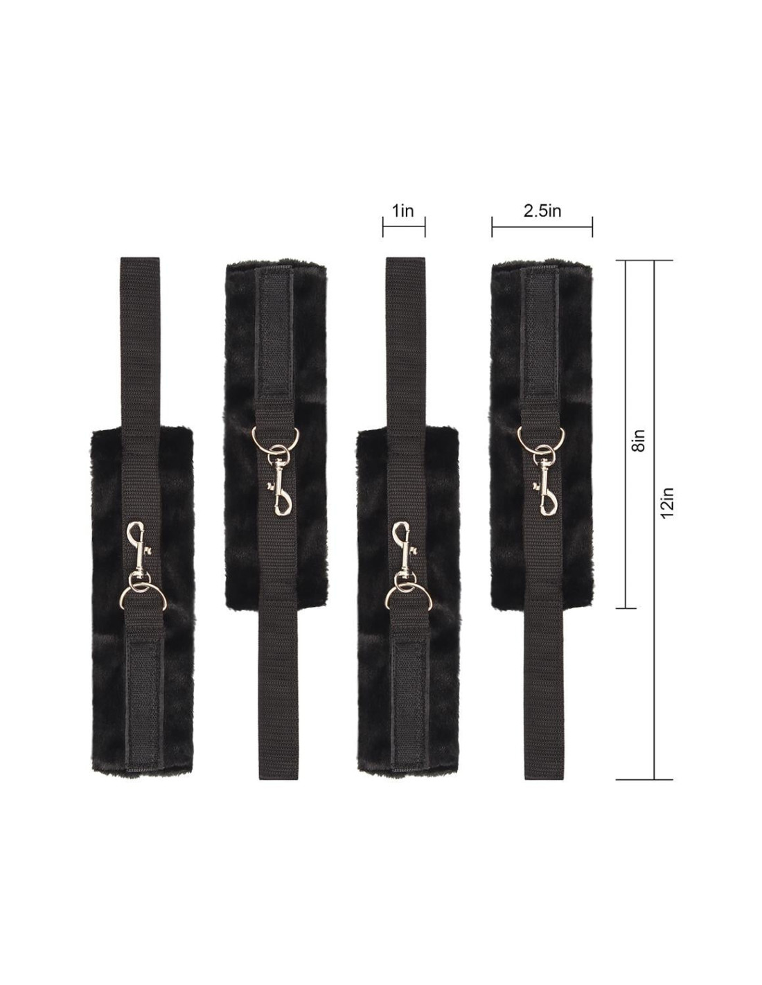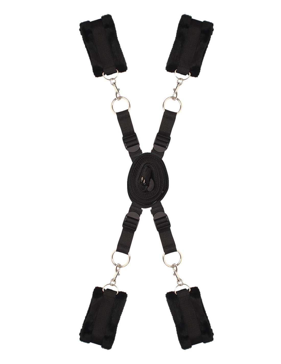 A bed restraint set with wrist and ankle cuffs. Simply slide the straps under the bottom of your mattress either from top to bottom side or side to side to customize your bondage play. The straps can be adjusted to the size of the bed with the plastic buckles. The cuffs are made of fake fur, soft and fluffy, and comfortable to wear, with Velcro closures. They attach to the O-rings of the bed straps with convenient musketon hooks. A restraint set is a great BDSM tool, but use it with care and never leave a bound person unattended.Bed restraint set with wrist and ankle cuffsThe straps can be adjusted to the size of the bedMaximum length 3,05 metersCuffs made of fake fur, soft and fluffyThey attach to the O-rings of the bed straps with musketon hooks