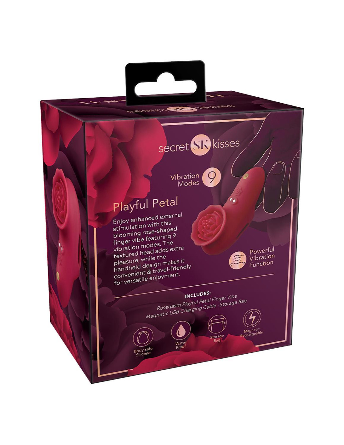 Enjoy enhanced external stimulation with the Rosegasm Playful Petal Finger Vibe. This blooming rose-shaped finger vibe features 9 vibration modes and magnetic USB rechargeable. The textured head adds extra pleasure, while the handheld design makes it convenient & travel friendly for versatile enjoyment.9 vibration modesPowerful vibrating functionSplashproofMade from bodysafe siliconeMagnetic USB RechargeableLength: 3.46 inch / 8,8 cmHeight: 1.96 inch / 5 cmWidth: 1.49 inch / 3,8 cmWeight: 0.11 lbs. / 49 grMaterials: SiliconeLithium Ion BatteryIncluded:VibeStorage BagMagnetic USB Charging CableInstruction Manual
