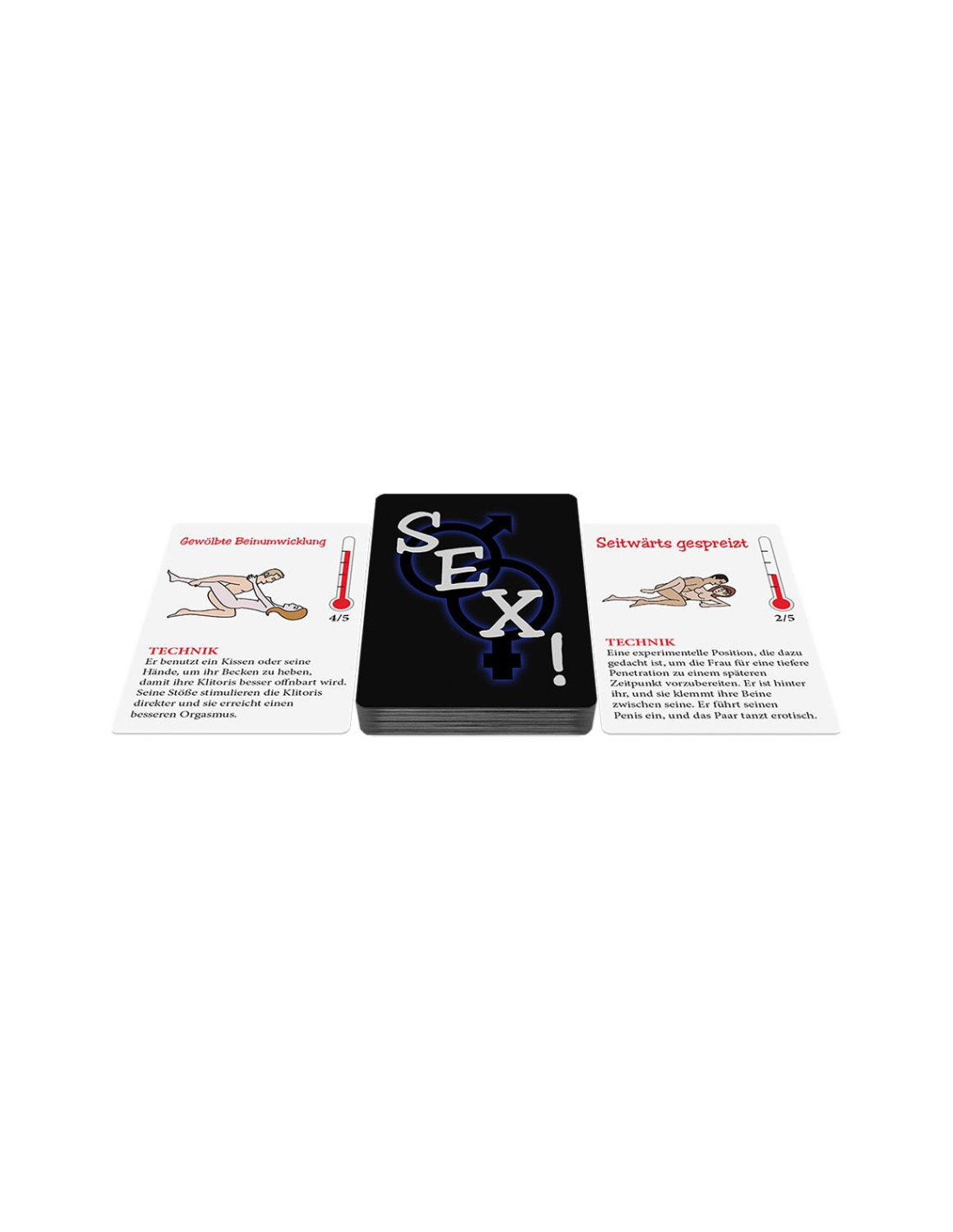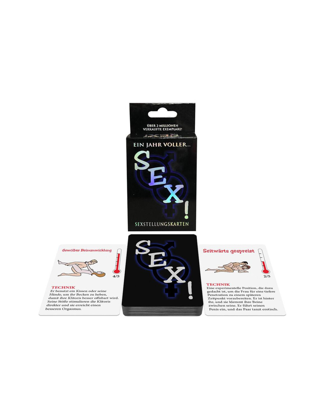 Ein Jahr Voller… Sex! Unser meistverkauftes Kartenspiel „Sex!“, auf Deutsch! Our best selling 'Sex!' Card Game, in German!Each Card explicitly illustrates either a foreplay activity or a sexual position, and the colour represents the intensity of the position. Each deck includes three card games. After building the fantasy, you both act it out.Game Includes: 50 SEX! cards, 3 rule cards, and 1 Unleash Your Fantasy card.'Ein Jahr Voller Sex!' offers you over 50 different Kama Sutra positions. Use the cards as positional references or play one of the three SEX! games to build your fantasy. Each 'Ein Jahr Voller Sex!' card offers a sex position illustration, technique instructions, and a challenge rating of 1-5, with 5 being the most intensely orgasmic. Includes new artwork to the packaging and sex position cards. German language.