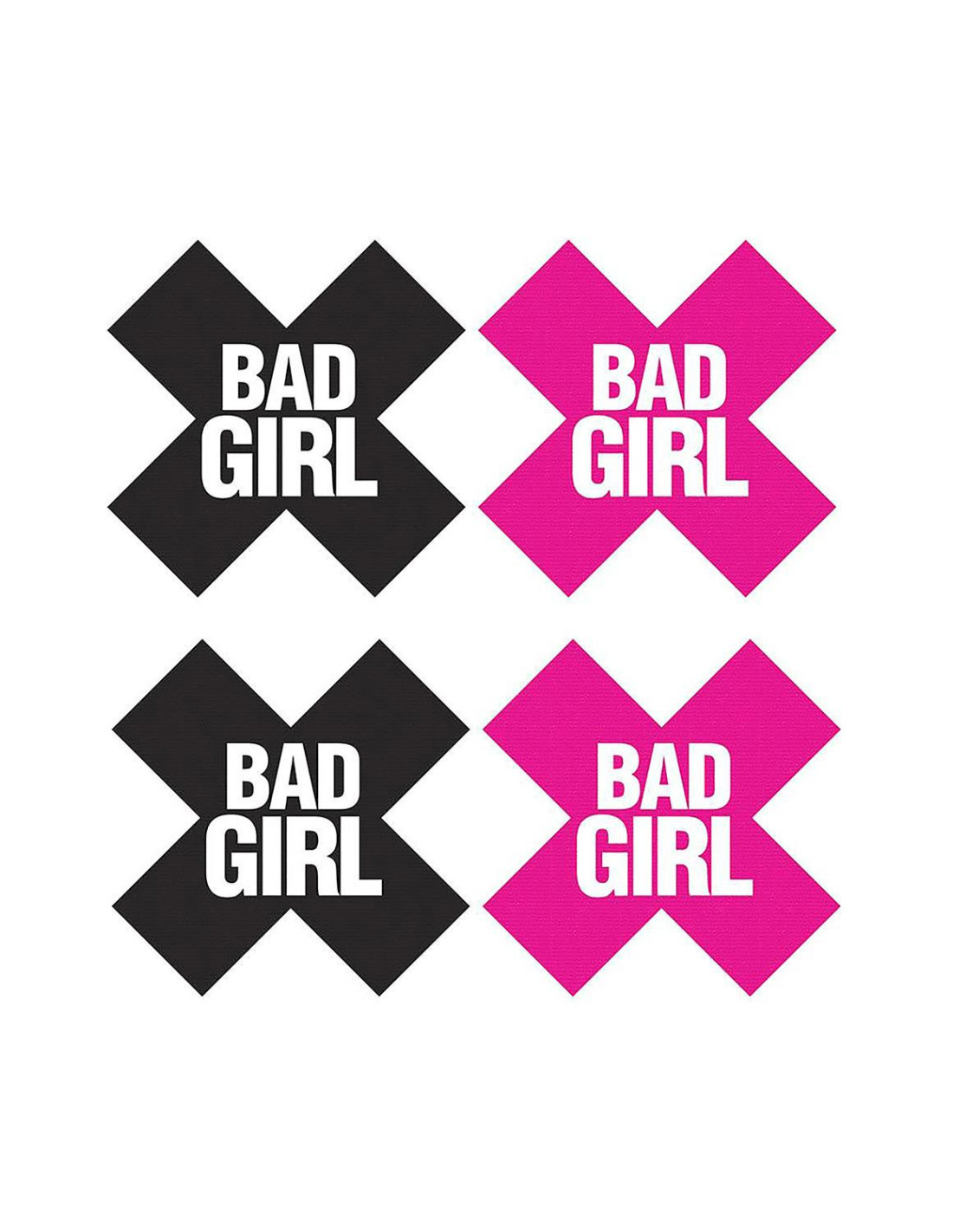 For whatever the occasion, Peekaboos Pasties has the perfect pasty for you. The high-quality, detailed pieces of the Peekaboos Pasties collection provide a vast assortment of styles. With design elements ranging from simplistic ‘X’s and hearts in classic colors, to playfully flirtatious tassels, from jeweled adjustable rings to crystal open designs, Peekaboos Pasties offers a selection of the finest in pasty adornment. Whether you search for something subtle to wear under a sheer top or something outrageous to make an outfit of its own, Peekaboos is sure to provide the perfect option for today’s vivacious woman.Self-adhesive x shaped pasties with Bad Girl written in whiteA hot pink set and a black set Soft and pliableSimple peel the pastie from its backing and apply the sticky side toward the skin