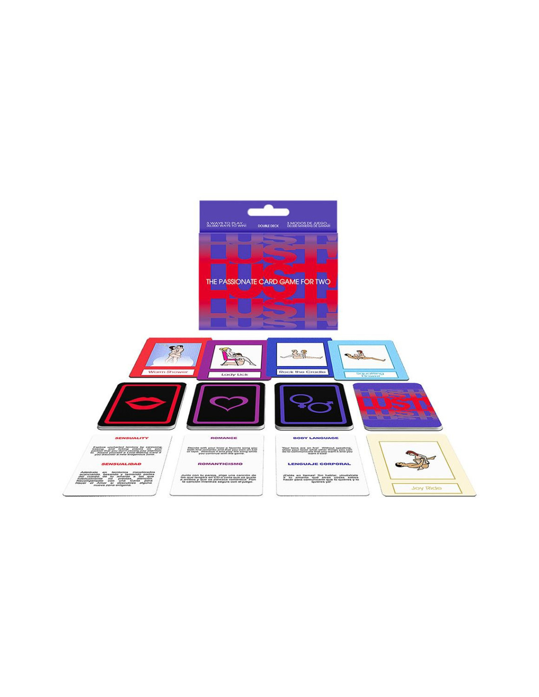 Lust! is a game for lovers that allows you to explore both romantic and physical intimacy with your lover. The Love-Making Cards explicitly illustrate either a foreplay activity or a sexual position. You and your lover use these cards to build and agree on a sexual fantasy. Includes:20 Romance cards20 Sensuality cards20 Body language cards40 Love making cards4 Game rule cardsEach game ends with a unique love-making experience. Language: English and Spanish