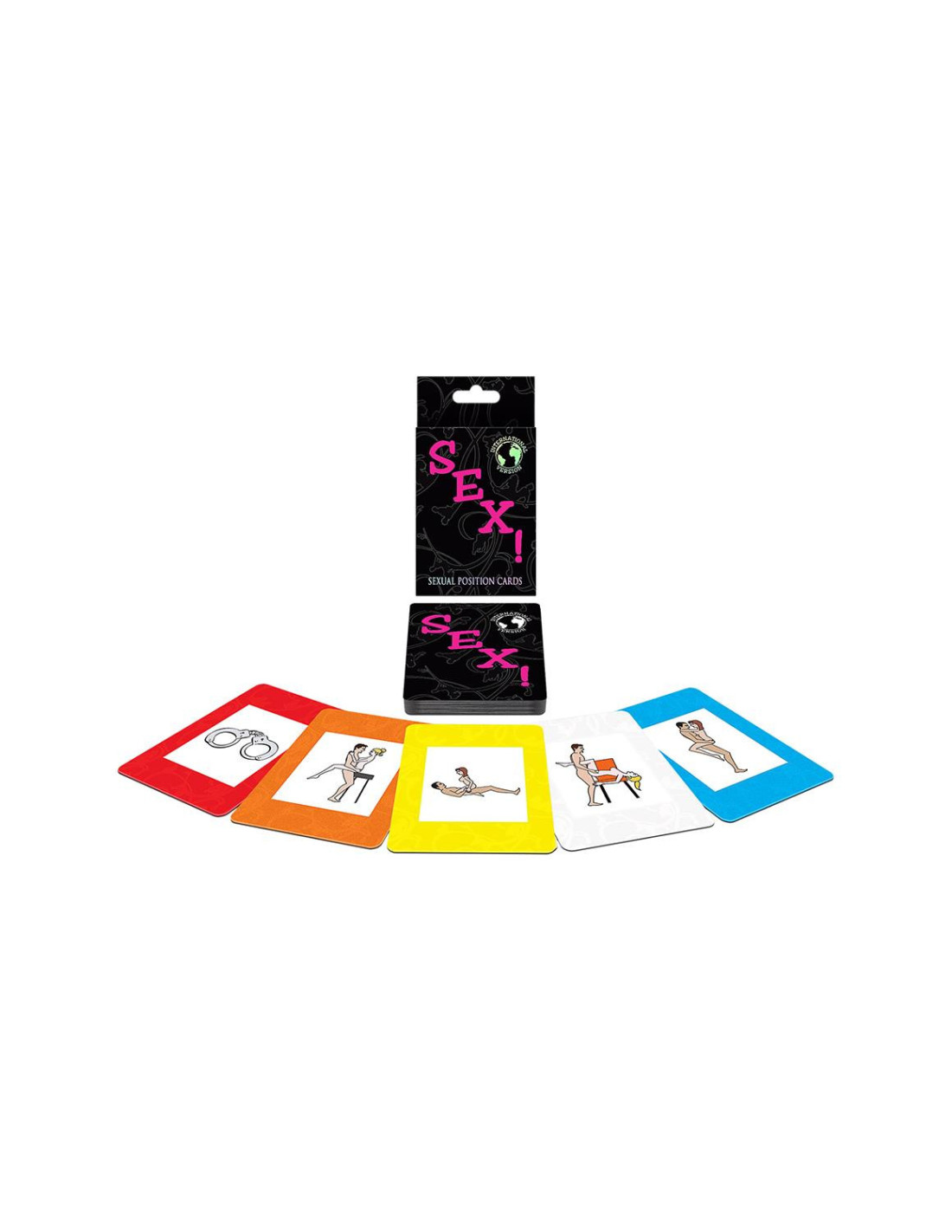 Each Sex! card explicitly illustrates either a foreplay activity or a sexual position. The Sex! deck includes three card games. While playing a card game, you and your lover use the cards to plan out one of the 100.000 possible fantasies. After building a fantasy, you both act it out. Rules are in 12 different languages.