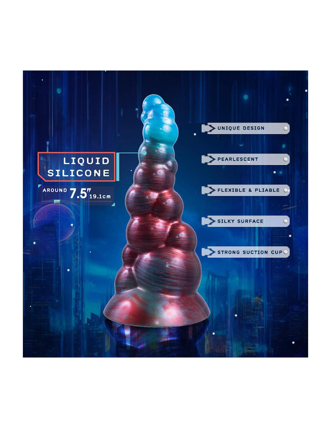 Monster dildo with strong suction cupWith pearlescent effectMade of Liquid SiliconeSilky surfaceFlexible and pliableUnique designStrong suction cupLength 7.5 inch / 19 cm
