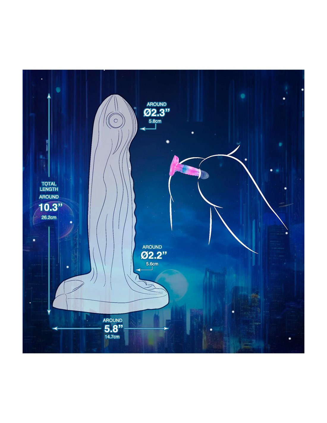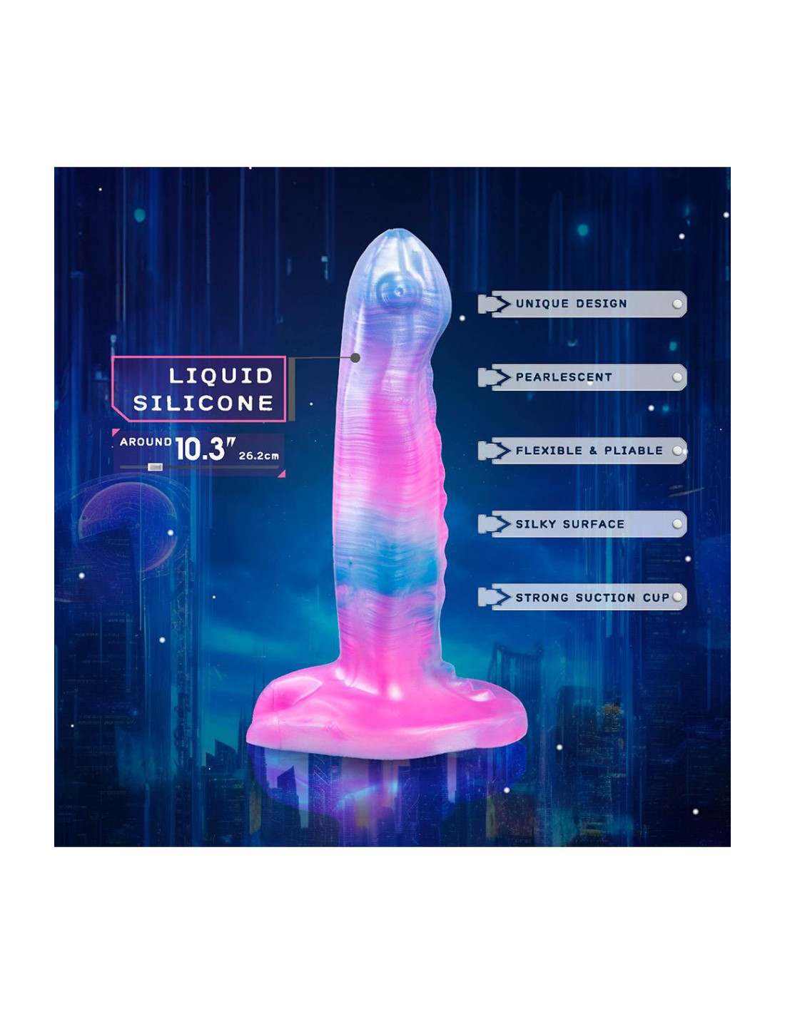 Monster dildo with strong suction cupWith pearlescent effectMade of Liquid SiliconeSilky surfaceFlexible and pliableUnique designStrong suction cupLength 10.3 inch / 26,2 cm