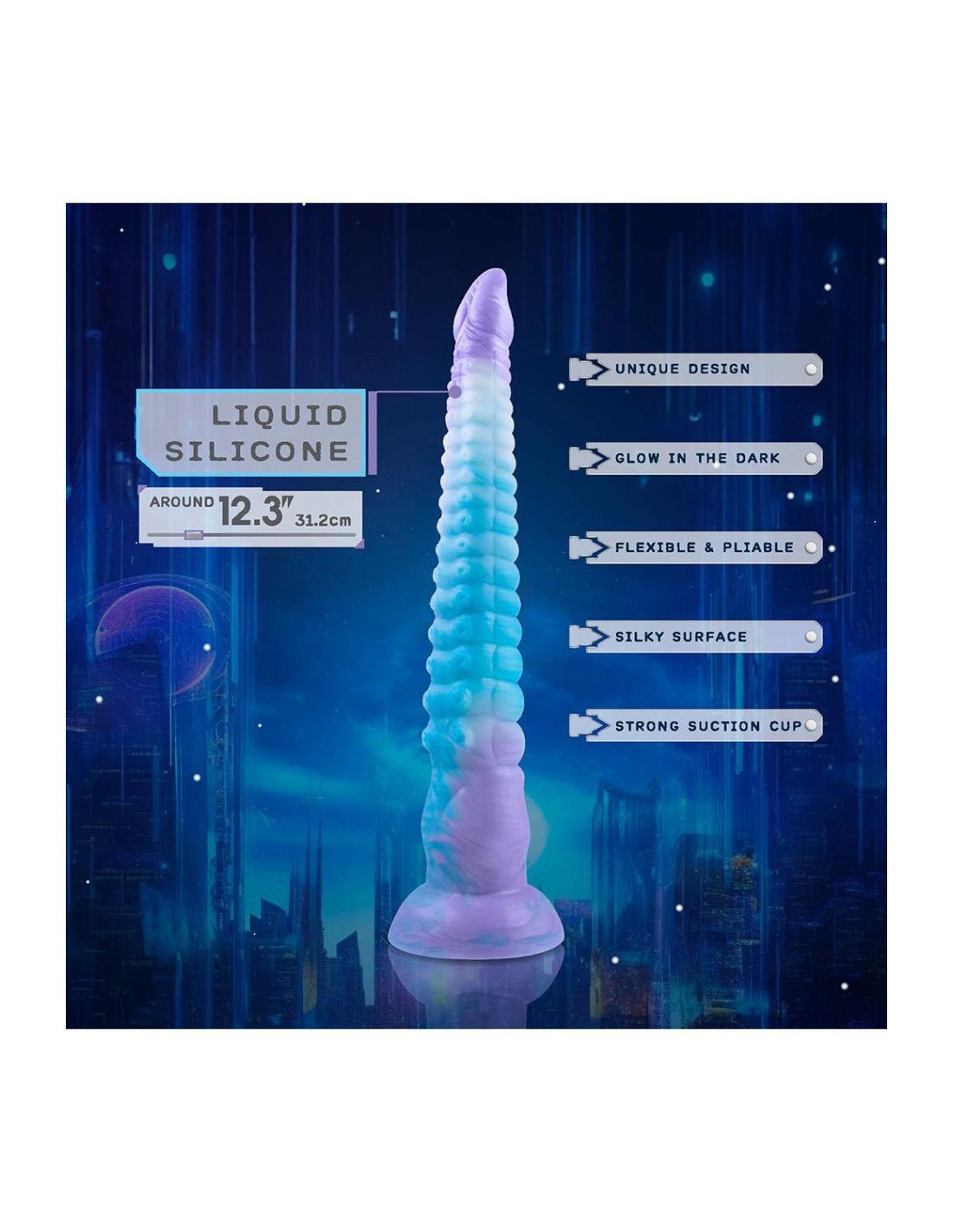 Monster dildo with strong suction cupWith glow in the dark effectMade of Liquid SiliconeSilky surfaceFlexible and pliableUnique designStrong suction cupLength 12.3 inch / 31,2 cm