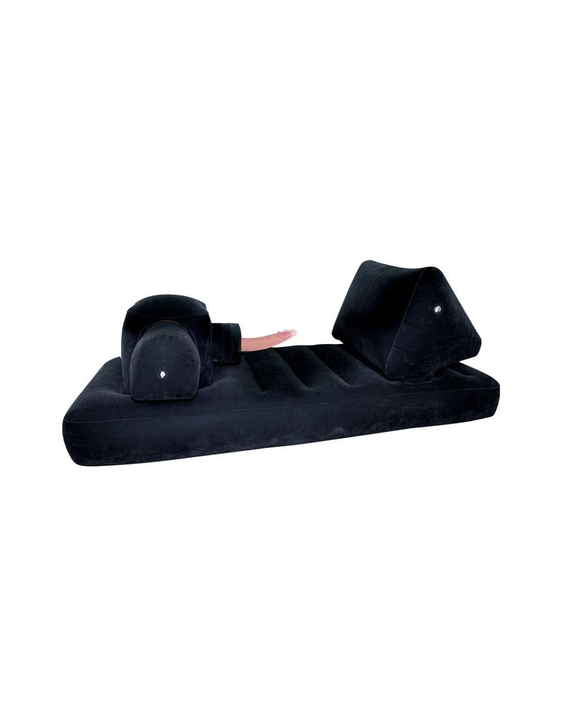 Premium inflatable bed with velvet surfaceWith thrusting machine and wireless controllerVibrator moves in forward and backward motionRemote conroled with 3-speed thumpingErgonomic design for sex positionsRechargeable air pumpIncluded:2 Vibrating silicone dildos, length 7 inch / 17,8 cm and 6.5 inch / 16,5 cm1 Rechargeable air pump1 Rechargeable power pack1 Charging cableDimensions: