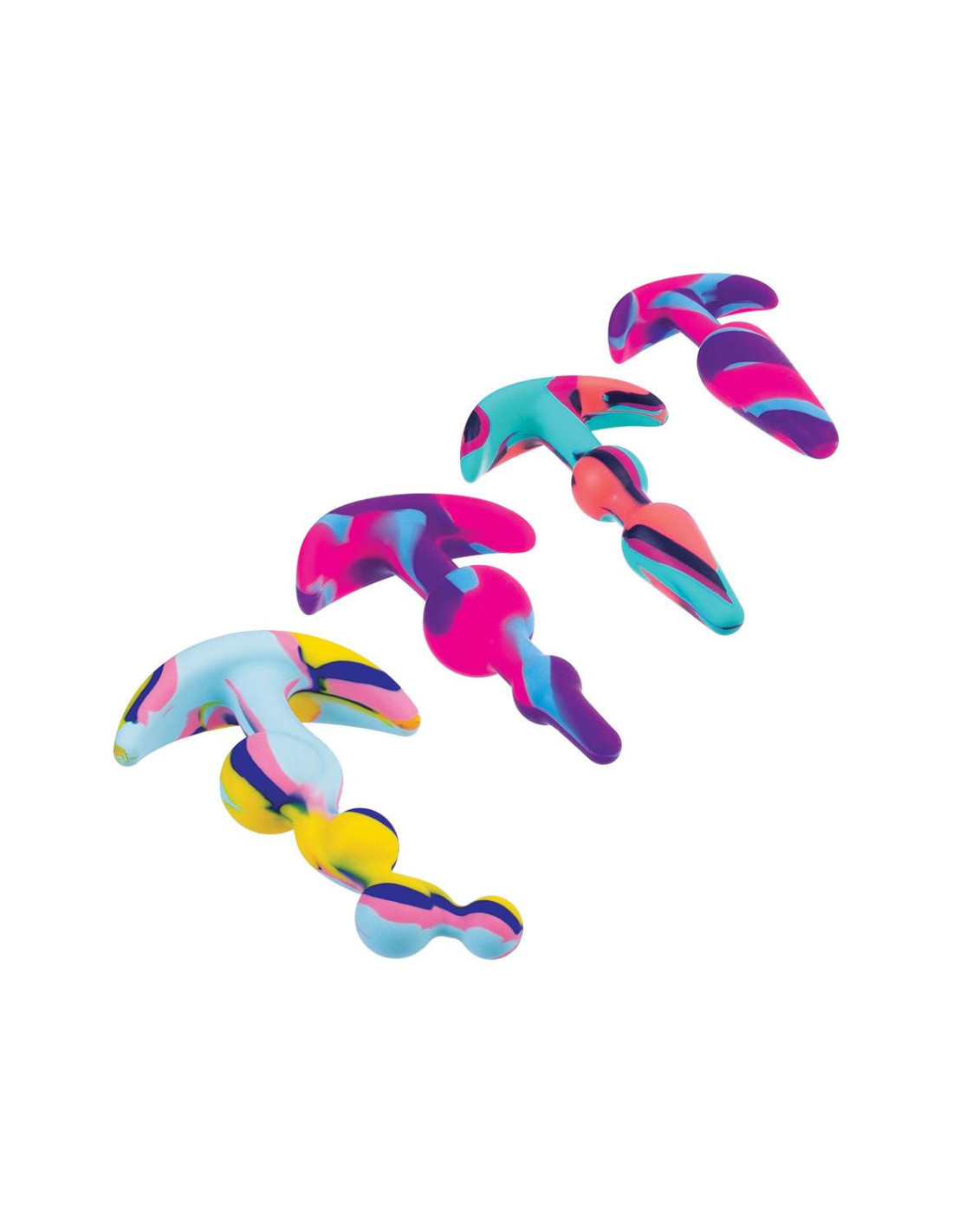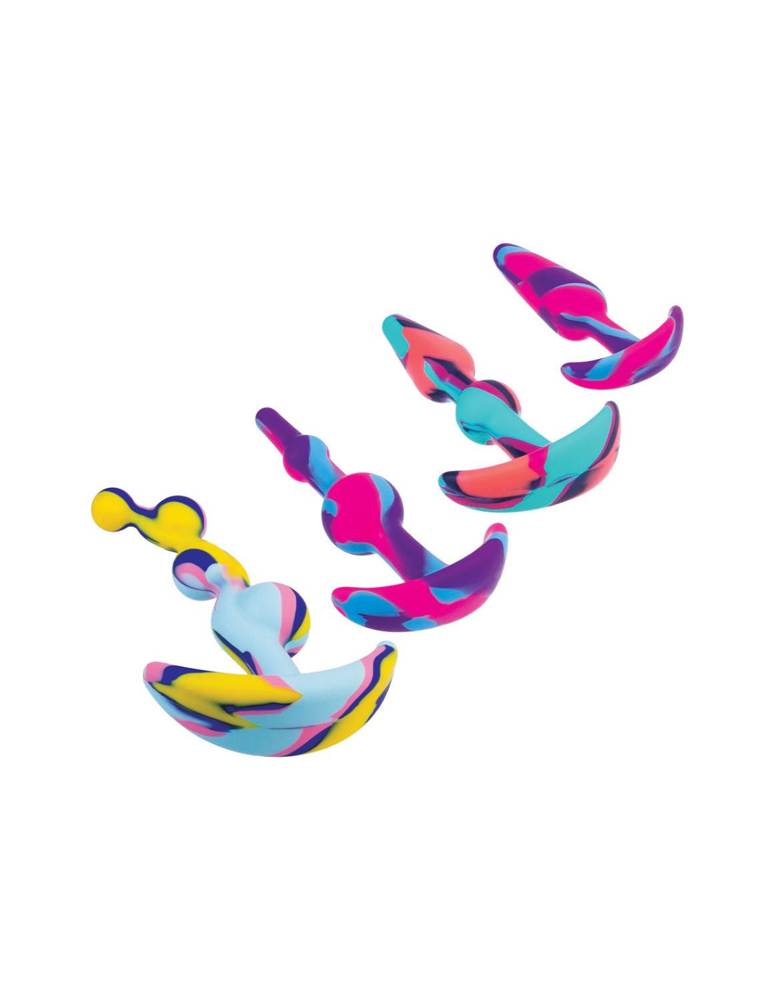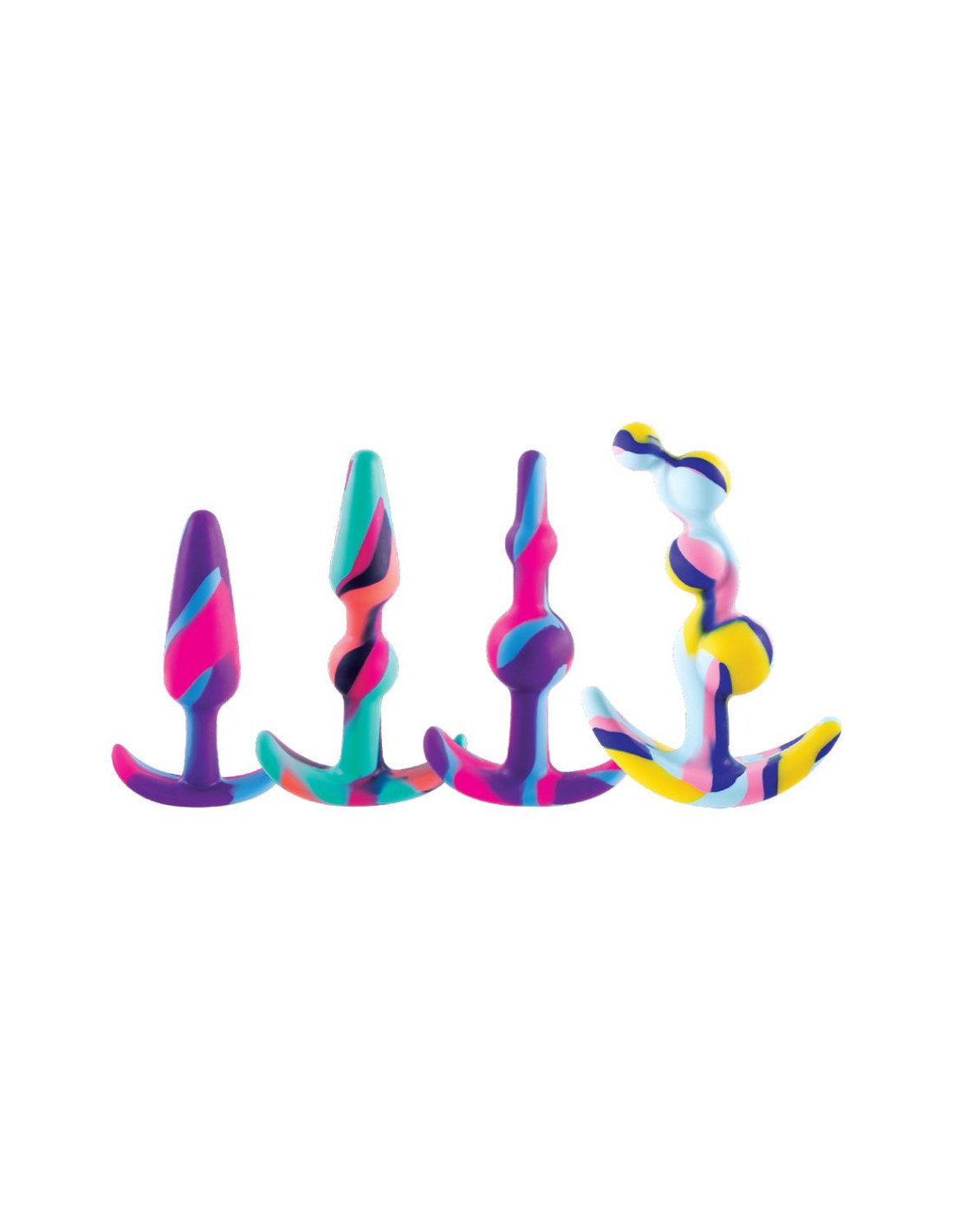 Set of 4 Butt PlugsMulti-colouredMade of siliconeNew advanced colour mixing technologyPerfect for beginnersPremium SiliconeErgonomic designSuction cup baseSizes: 3 inch, 4 inch, 4 inch, 4.5 inch / 7,6 cm, 10,1 cm, 10,1 cm, 11,4 cm
