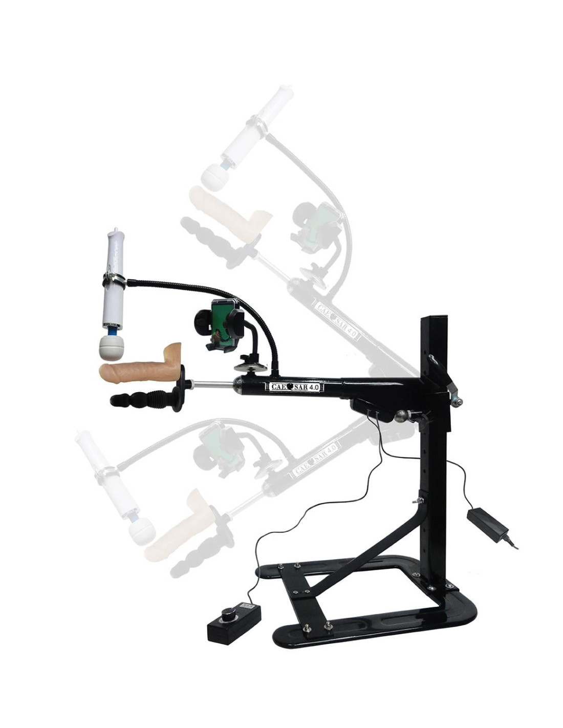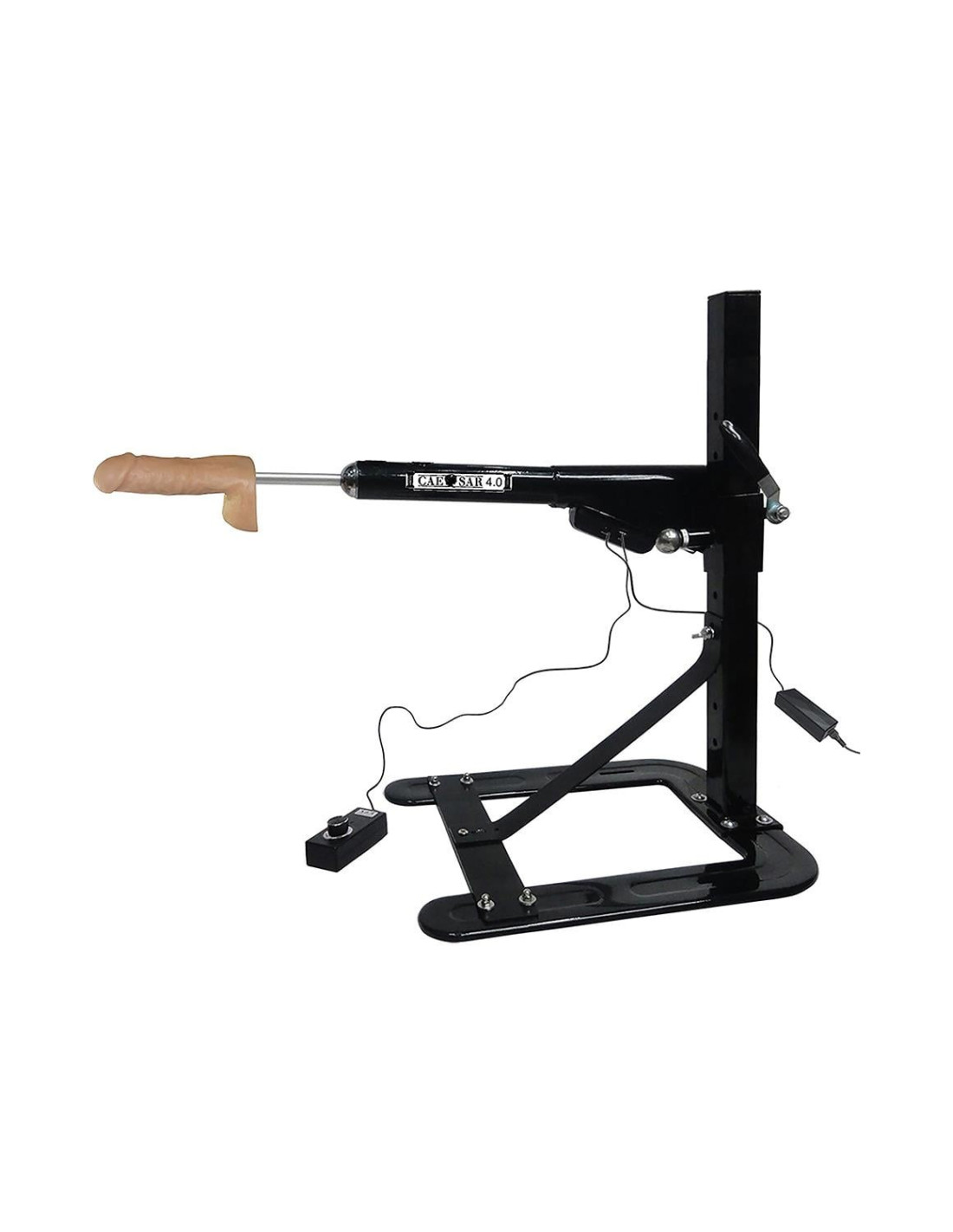 The Caesar 4.0 has greatly increased its torque and power to enable 45 to over 260 very smooth strokes per minuteThe new 40 degree angled, T-shaped braze stabelising the trusting arm enables excellent stability at all speeds of thrustAmazing fast speeds, over 4 speeds every second!Easy height adjustmentsComplete angle adjustmentsThe flat legs now have a thicker, improved rubber base for strong adherence to your floorQuiet and powerfulUnlimited positions: go vertical, go horizontal, go crazy!The Caesar Love Machine slides between your mattress and box spring (remove brace) or simply sits on the floor with its non-marring, non-skid baseThe thrusting arm rotates nearly 180 degrees so you can have any position that you can imagineGrip-It wand-and-vibrator holder enables simultaneous clitoris stimulation, use with or without the C-clampAdjustable large diameter round clamps for large wandsAdjustable small diameter round clamps for small wands and standard vibratorsAdjustable C-clamp grip, C-clamp attaches to a chair, furniture or almost anywhereRemote controlled, thrusting speeds with a multi-speed controllerInput: Either 110/120 Volts (60 Hz) or 220/240 Volts (50 Hz)Output: 24 Volts, 4 AmpsWeight 26 lbs / 11,79 kgThrusting arm height: adjustable from 13 inches (33 cm) to 26 inches (66 cm)Base size: measures 20 inches (50 cm) long by 16 inches (40 cm) wideTotal vertical mast height 27 inches (68 cm)Wand massager not includedAccessories:An 8 inch long, realistically looking-and-feeling penis made from RoHS, medical grade TPR with large stimulating balls easily attaches to the shaft in the thrusting arm for vaginal and clitoral stimulationAn exciting, self-lubricating, rigid, soft skin stimulator made of TPR (Feelsoft TM) attaches to the shaft in the thrusting arm for anal fun. Easy to clean grooves and ridges hold lubricant enabling continuous lubrication during thrusting, slippery and thrillingMobile phone holder for filming and watching the action (phone not included). Multi-functional positioning. Enables filming and watching the action. Transparent frame holds personal photo. Spring activated, cushioned side-grips to safely hold your phone. Swivel base rotates 360 degrees with locking button to aim and lock the mobile phone in the desired position. Silicone suction cup with spring activated snap-lock for extra surface gripping.A flexible-yet-rigid gooseneck with an adjustable C-clamp, and also adjustable round clamps to fix rigidly to almost any wand or vibrator enables thrilling stimulation to the pubic area and the clitorisAn easy turning dial for adjusting the speed of the thrusting arm from 45 to over 260 rpmA dual penetrator-holder included for enabling simultaneous stimulation to the anal and vaginal areas. Try different shapes and sizes of dildos for more excitement. Fits all Vacuum-Lock TM and Vacuum-Grip TM dildos.Unlimited positions:Go vertical, go horizontal, go crazy! Simply place the Caesar 4.0 love machine on the floor with its non-marring, non-skid base or slide it between your mattress and box spring for fun usage in the bed. Remove the 40 degree angle stabilizer to slide the Caesar 4.0 beneath the mattress. There is complete angle adjustability, the thrusting arm rotates nearly 180 degrees so you can have any position that you can imagine. Quiet and powerful:The flat, wide legs have a thick rubber base for strong adherence to the floor or mattress. The motor operates at a safe, low voltage and contains a powerful gear system to maximize your pleasure. New stability structure:Enjoy Caesar 4.0 with its new T-shaped, angled brace achieving an extremely stable and steady love machine during thrusting at all speeds.